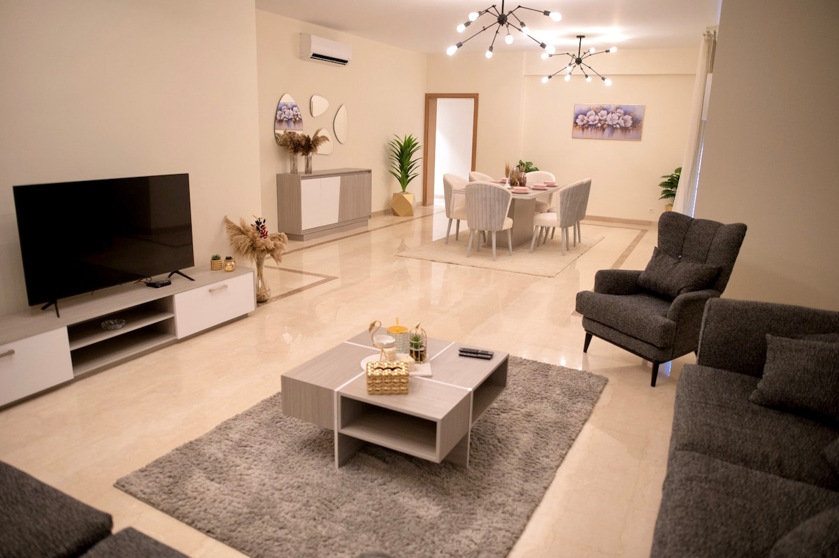 Stvorite trajne uspomene u našem luksuznom stanu u hotelskom stilu, dizajniranom s vrhunskim dekorom i sofisticiranim detaljima. Bilo da putujete s porodicom ili ste u poslovnom putovanju, naš jedinstveni smještaj nudi udobnost, eleganciju i pravi osjećaj doma. Smješten u otmjenoj zajednici, stan pruža besplatan pristup privatnoj teretani i bazenu u zgradi.