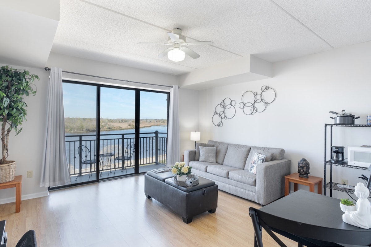 Private Downtown 1BR Condo on the 5th Floor with Private Balcony, River Views, & On-Site Parking Close to UNCW, Live Oak Bank Pavilion, Wilmington Convention Center, & the Beach ★ “Really great place! Beautiful, safe environment.” ☞ Private balcony with outdoor seating ☞ River views ☞ Fully stocked kitchenette ☞ On-site private parking (1 car) ☞ On-site washer & dryer ☞ Dedicated workspace ☞ 2 Smart TVs ☞ Fast WiFi (421 Mbps)