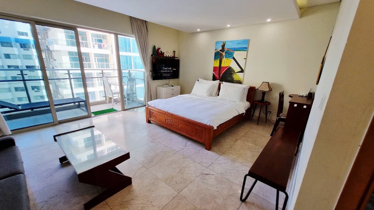 Moj stan se nalazi na gornjim spratovima hotela s 5 zvjezdica u centru Nha Tranga, dijeli ga sa svim hotelskim sadržajima, uključujući veliki vanjski bazen i teretanu. S odličnim balkonom s pogledom na more možete direktno uživati u prekrasnom krajoliku plavog okeana i zlatnoj plaži s balkona. Ili možete uživati u romantičnom izlasku sunca na moru sa svojom porodicom u ranim jutarnjim satima.