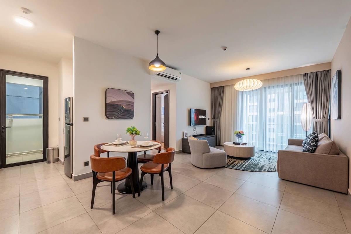 **AIRPORT PICKUP SERVICE AVAILABLE** ⚪️🎀⚪️Apartment in high-class & fireworks view so it’s definitely worth your pay. FREE all 5-star facilities - 108m2. Inspired by modern-art style, it surely brings you a fresh and chilling stay to enjoy your memorable trip. Especially match with your kids’s entertainment with the water slide, sauna, infinity pool, jacuzzi. ❇️ suitable for families/business trip, the perfect place for couples, staycation, great place to relax after a working day.