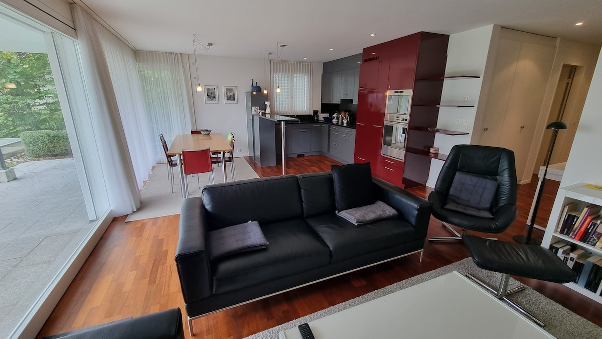 Elegantan i udoban privatni stan, smješten u centru (4 minute do autoputa) između Luzerna (20 min) i Interlakena. Mirno smješten na rubu sela u srcu Švicarske i okružen prirodom, nudi terasu, krovnu terasu sa zadivljujućim pogledom (Mt Pilatus), 2 spavaće sobe, kuhinju, dnevni boravak i trpezariju, kupatilo i parking. Supermarket (5 minuta hoda) i restorani u blizini. Poznata jezera udaljena nekoliko minuta. Savršeno za uživanje, pješačenje, vožnju biciklom, skijanje i opuštanje u svim godišnjim dobima.