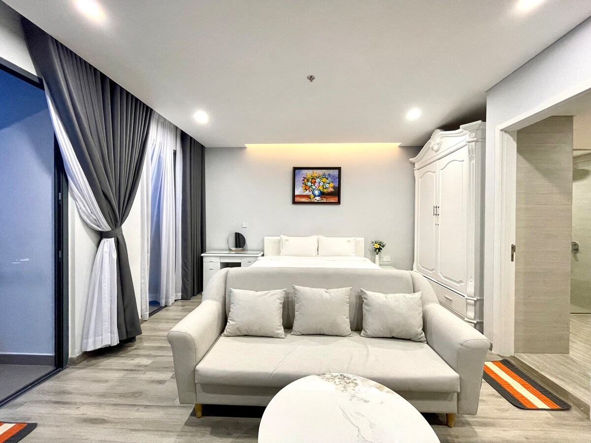 Stan s punim opcijama s pogledom na okean - Marina Suites apartman nudi udoban, privatan osjećaj kao da boravite u svom domu kada putujete, s punim sadržajima i direktnim pogledom na more. Na centralnoj lokaciji, potrebno je samo 5 minuta hoda do plaže na plaži Tran Phu. Radijus od 500 metara do specijaliziranih restorana i mnogih mjesta za dnevnu i noćnu zabavu. Stan je veličine 44 m2, 1,8 m x 2m krevet pogodan za 2 odrasle osobe i 1 djecu mlađu od 6 godina.