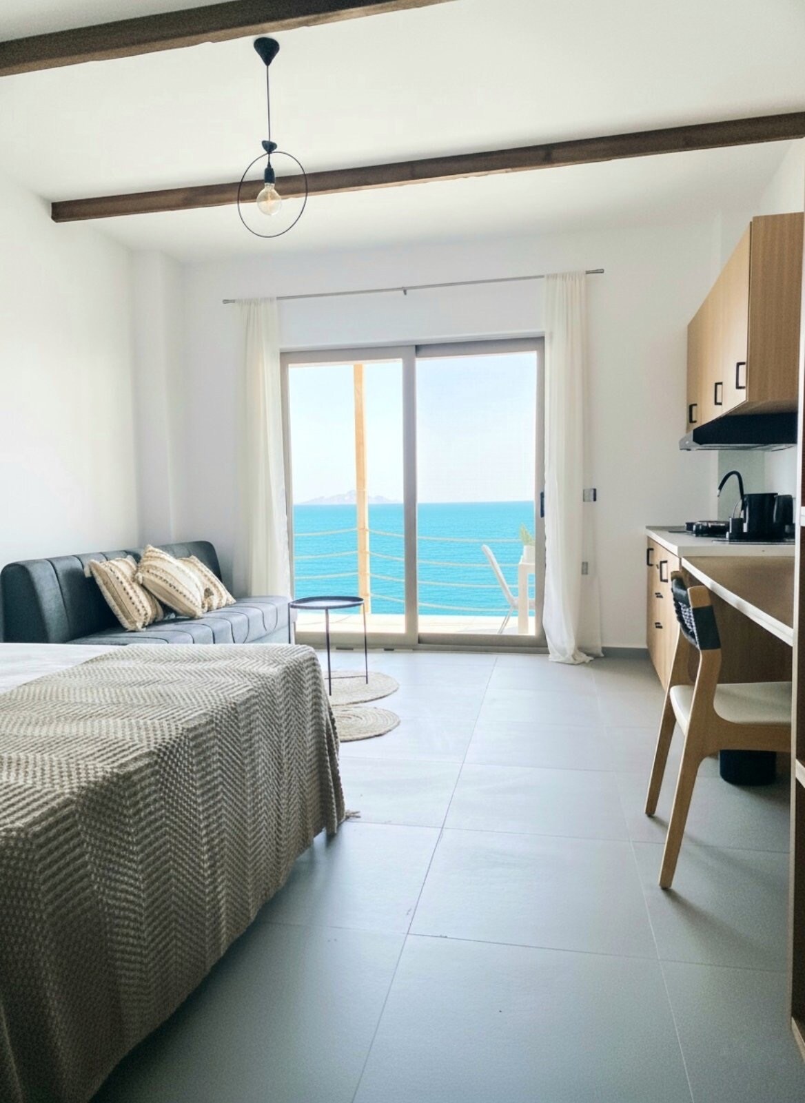 Experience comfort and elegance in our fully equipped sea-view apartment, accommodating up to 6 guests. It features 2 bedrooms (one with a double bed, one with two single beds), 2 full bathrooms, a spacious living room with a sofa bed, a complete kitchen, and A/C in all rooms. Guests have access to shared outdoor areas with sunbeds and umbrellas, as well as free on-site parking. An ideal choice for a relaxing seaside stay.
