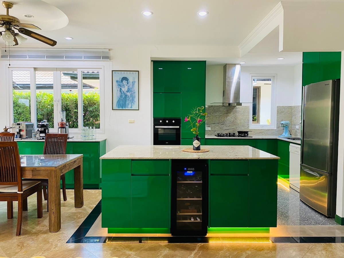 (ALL INCLUSIVE CIJENA) Ova divna kuća nalazi se odmah pored golf terena Royal Hua Hin u otmjenom i sigurnom kompleksu duž živahnog Soi 88 i samo nekoliko minuta vožnje od srca centra grada, plaže Hua Hin i najboljih trgovačkih centara (noćna pijaca, Market Village i tržni centri Blùport). Klub je udaljen 100 m i nudi (besplatan) beskonačni bazen, dječji bazen, teretanu i osmatračni toranj. 24-satna profesionalna sigurnost i upravljanje kompleksom.