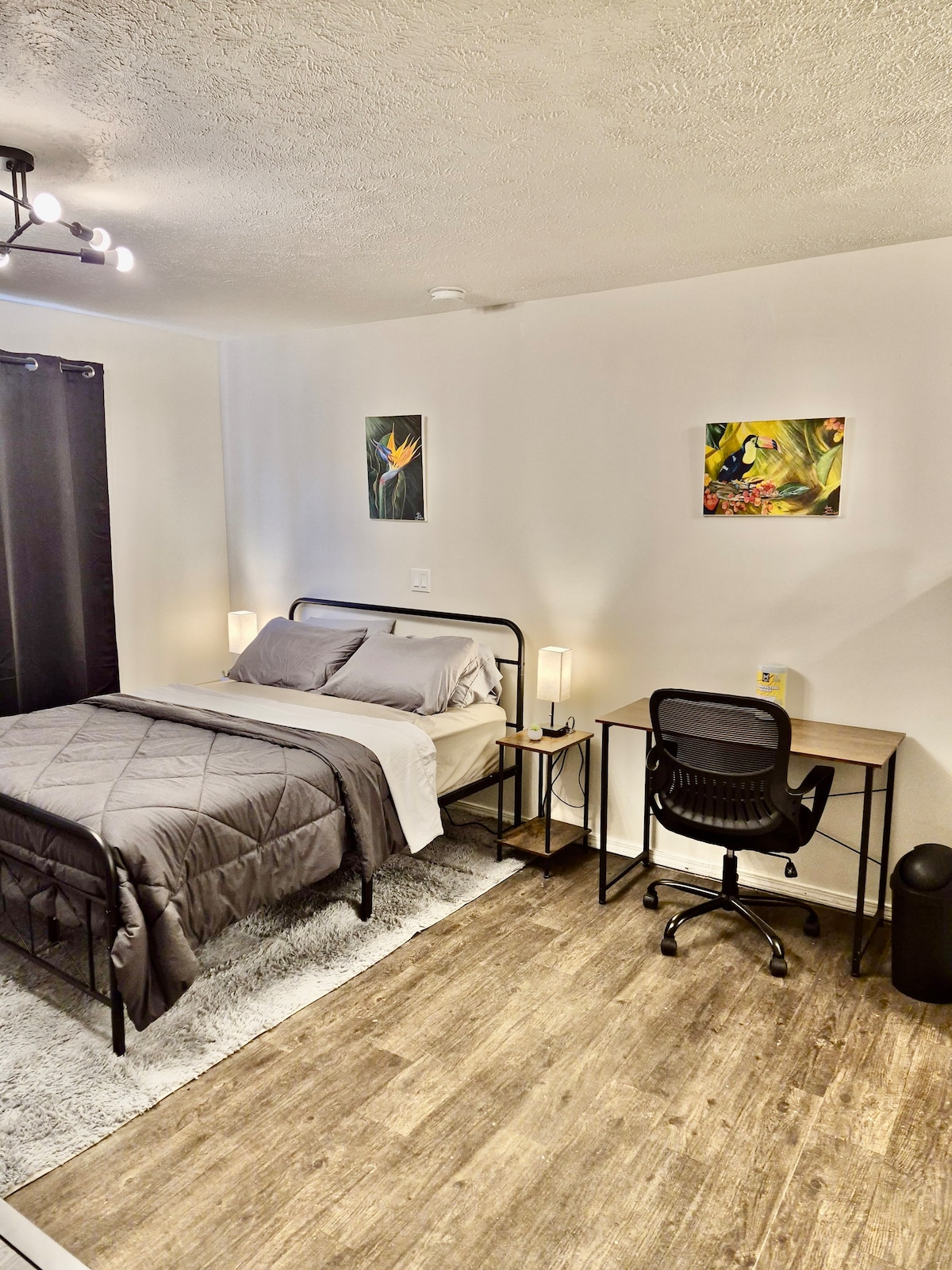 Entire apartment just for you! Spacious room, kitchenette, and bath with basic toiletries. Bedroom has a queen bed, desk and it is equipped with a 60 inch 4K TV. The kitchenette includes a fridge, coffee maker, microwave and free snacks. This is the perfect place for work and/or relaxation. Washer and Dryer are not part of the listing but I will give access to them upon request. I also provide Netflix, Disney and Hulu access upon request. All appliances are new and ready for you to use!