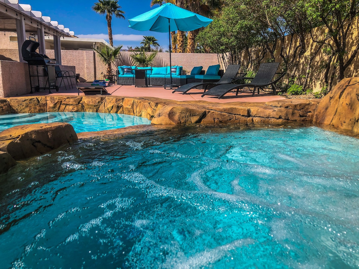 Freshly renovated Las Vegas home away from home with a resort pool oasis, custom fire pit gardens, new modern Clearwater jacuzzi with over 100 jets and water features for you to relax and enjoy, an outdoor kitchen BBQ patio area, and a fun outdoor game area! This single family home with a casita is located minutes from outdoor adventures, strip excitement, and beloved local attractions. Enjoy a relaxed modern Bohemian style with thoughtful touches to ensure a comfortable and memorable stay.