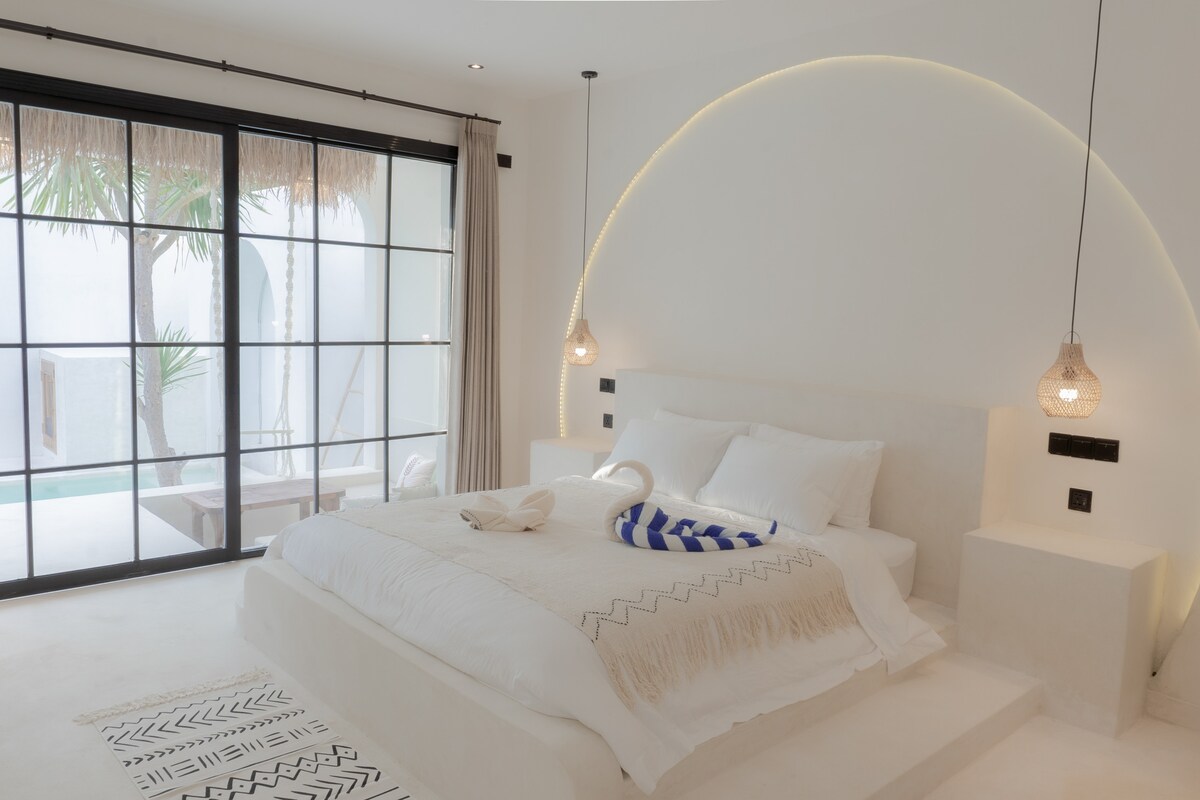 Naše seoske kućice u boho stilu imaju privatno unutrašnje kupatilo s tuš kabinom, bračnim krevetom i privatnim vrtom za vrhunsko opuštanje. Uživajte u velikom bazenu s vrećama za sjedenje i ležaljkama za sunčanje i posjetite naš bar za doručak (uključen) ili osvježavajuće piće. Uređenje je lagano, udobno i boemsko, s mnogo jastuka za dodatnu udobnost.