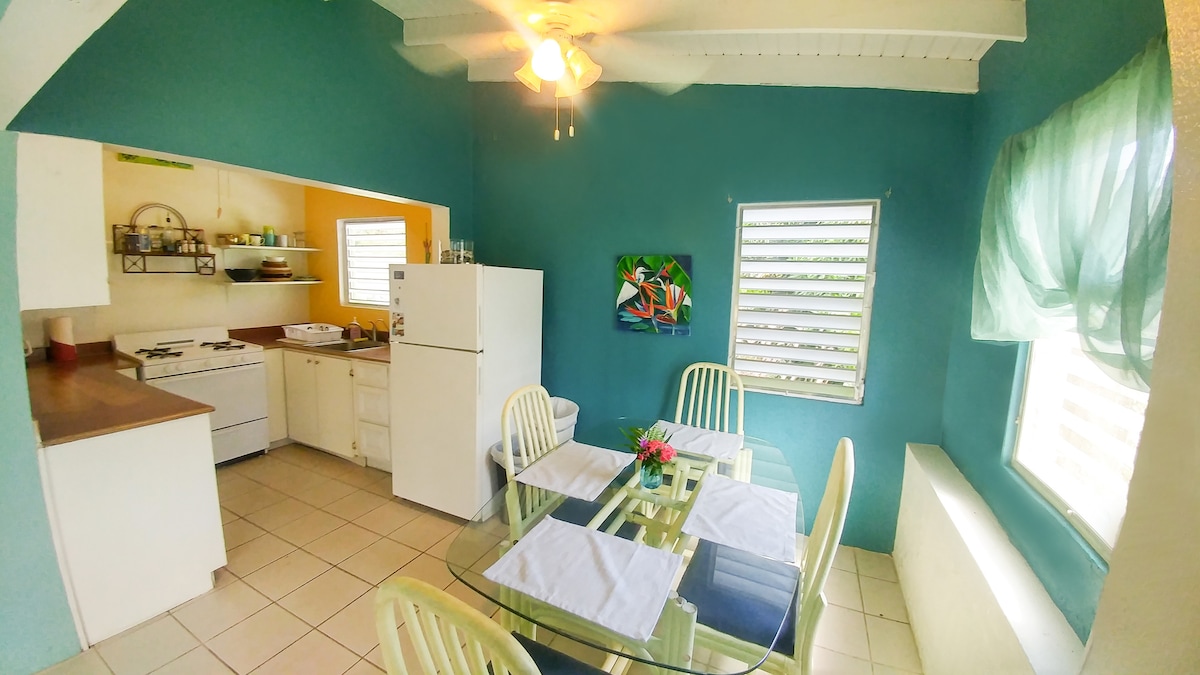 Pobjegnite u ovaj elegantni apartman za goste koji se nalazi u centru grada na gotovo hektaru tropskog zemljišta s palmama koje šapuću i voćkama. Ovaj novouređeni studio uključuje potpuno opremljenu kuhinju (sa začinima!) i mirno zajedničko dvorište s roštiljem. Udahnite karipski povjetarac, opustite se pod zvijezdama i uživajte u našem objektu prikladnom za 420 osoba; samo je zabranjeno pušenje u zatvorenom prostoru. Savršeno za parove, putnike koji putuju sami ili bilo koga ko traži mir, udobnost i autentičnu otočnu atmosferu.