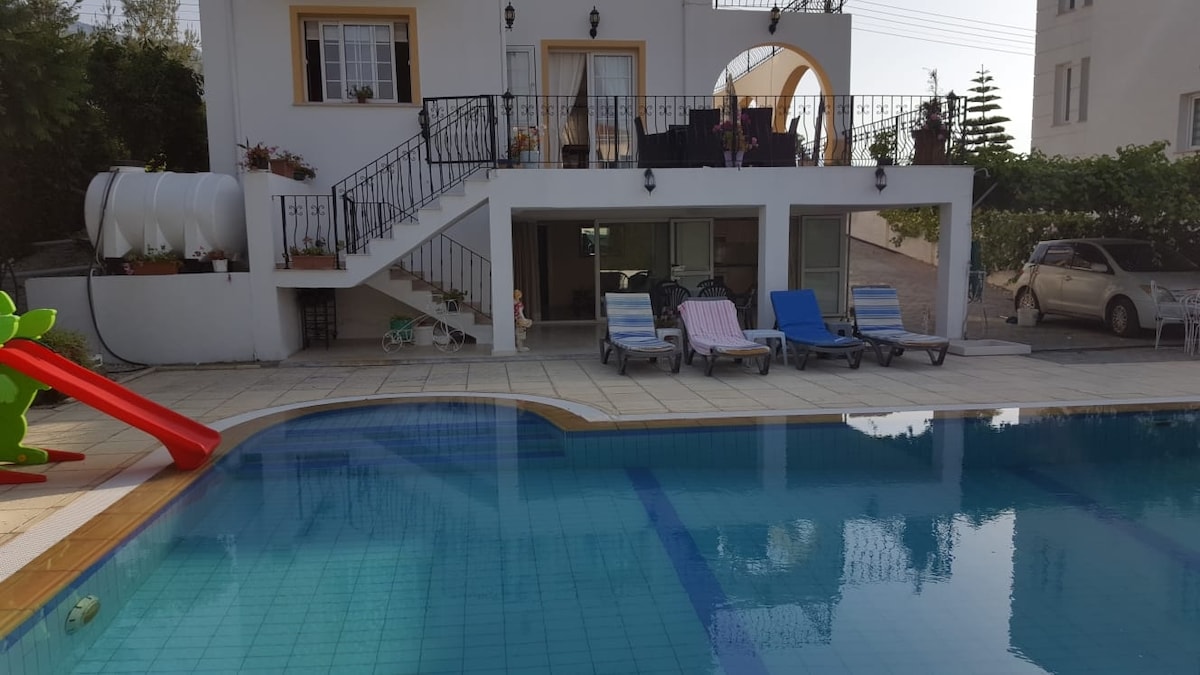 Botom of the villa se iznajmljuje jer vlasnik živi na vrhu vile, ali bazen je privet samo za gosta ..5 minuta vožnje do plaže 5 minuta vožnje do lokaliteta supermarket restorana hotela 10 minuta vožnje do luke Kyrenia.................................................................................................................................... kuća se iznajmljuje na donjem spratu, ali bazen pripada samo gostima......5 minuta messfede cratos hotel 2 min malpas hotel 5 min akapulko hotel 5 minuta vožnje automobilom i 10 minuta do luke Kyrenia svi idu automobilom
