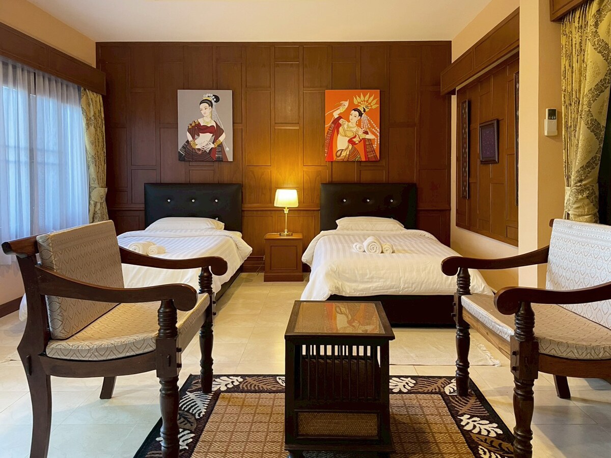 Suwarnburi House , a unique Thai authentic style home set in a verdant and floral atmosphere. The house has altogether five seperate rooms which two are fitted as a twin room and the other three as double rooms (every room has an ensuite bathroom). There is an out door pool and a hot tub, a beautifully decorated dining room and various seating areas within the premises.