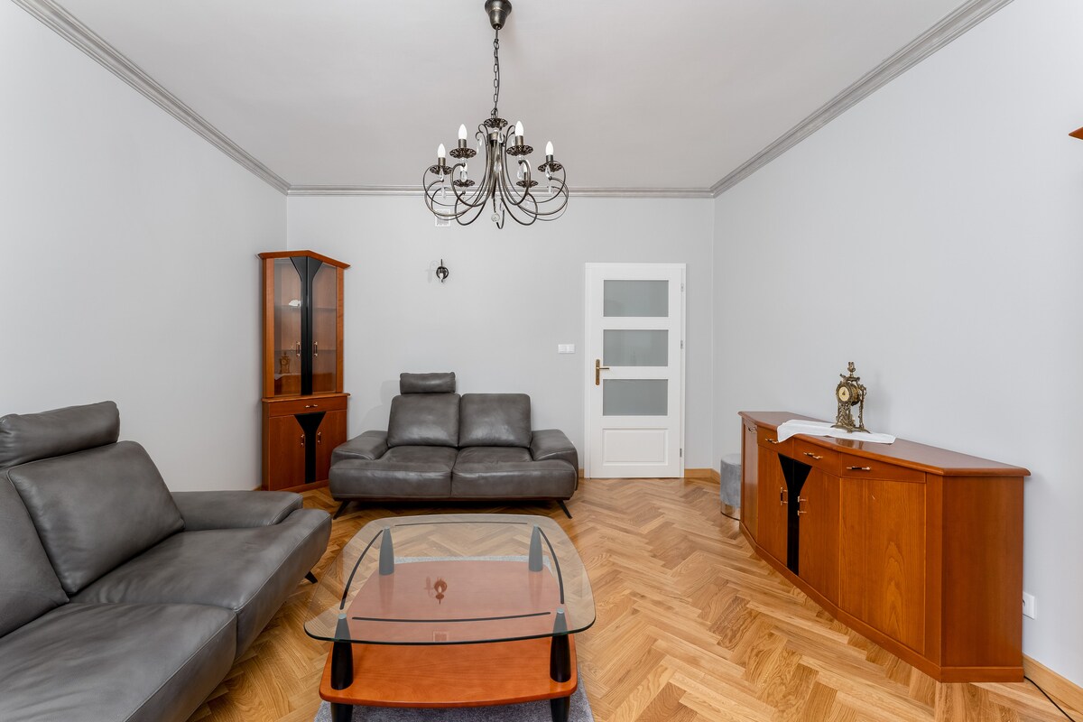 Welcome to the Royal Apartment. Designed for your convenience so you could feel that here is the place you belong to. 70sqm of the area on 1st floor in 2-storey building. - bright living room with 2 sofas, coffee table, TV. - fully equipped kitchen (induction hob, oven, dishwasher, hood, fridge) - the soul of the apartment is a corner bedroom with a unique view of the Wawel Castle (a double bed, a comfortable armchair, a coffee table with a set of chairs) - bathroom (shower) and toilet .