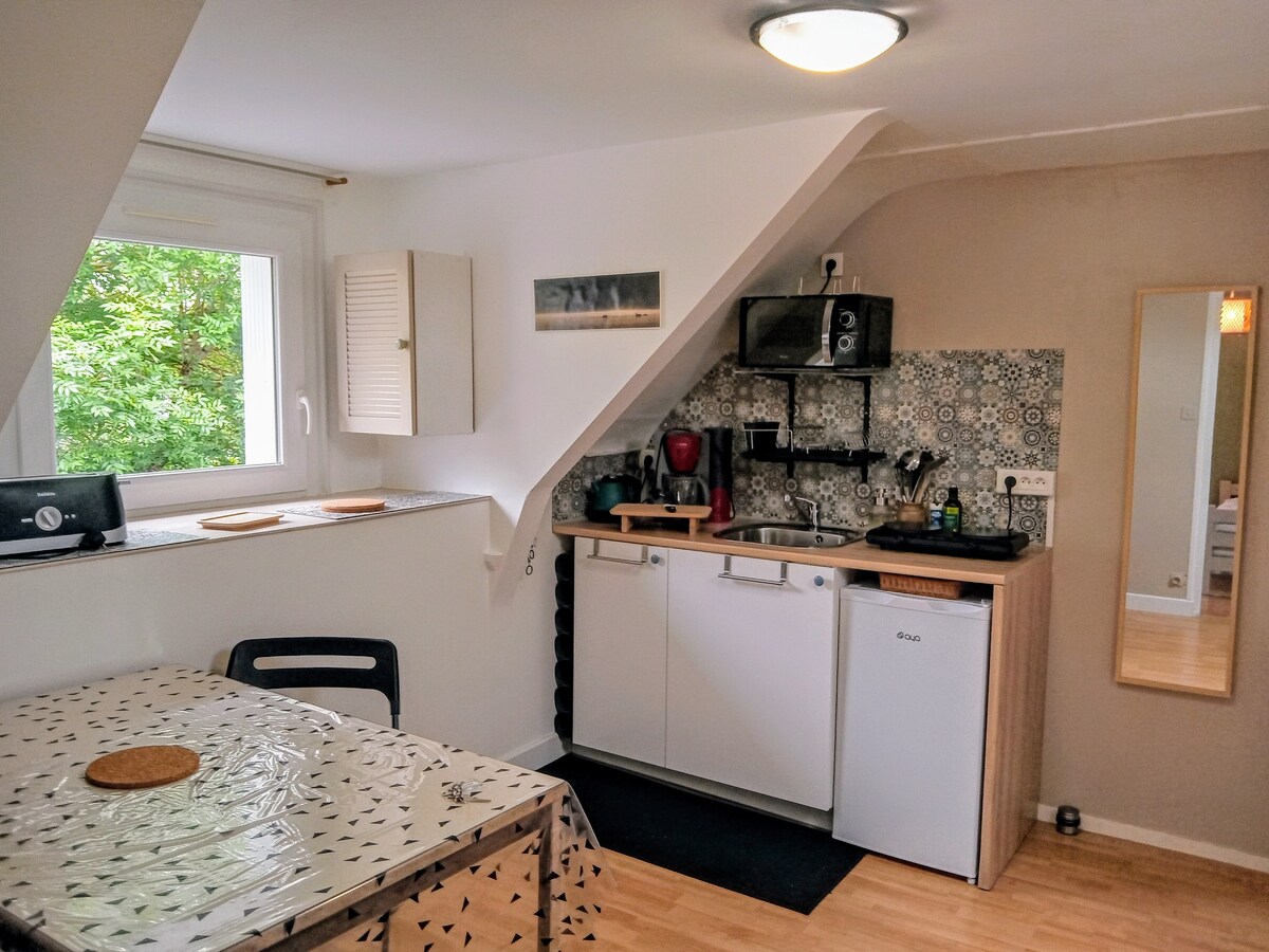 Ovaj studio je kreiran u prizemlju naše kuće. Imate zaseban ulaz u vrt i njegove ružičaste lovorike i parking mjesto na prilazu. Studio je u potpunosti opremljen pravom kuhinjom, radnim stolom i Wi-Fi mrežom. Idealno se nalazi 500 metara od pristaništa za ostrva Morbihan, na desnoj obali (25 minuta hoda od luke u centru grada). Iz Vannesa i posebno našeg okruženja, idealno ste locirani da posjetite Morbihan.