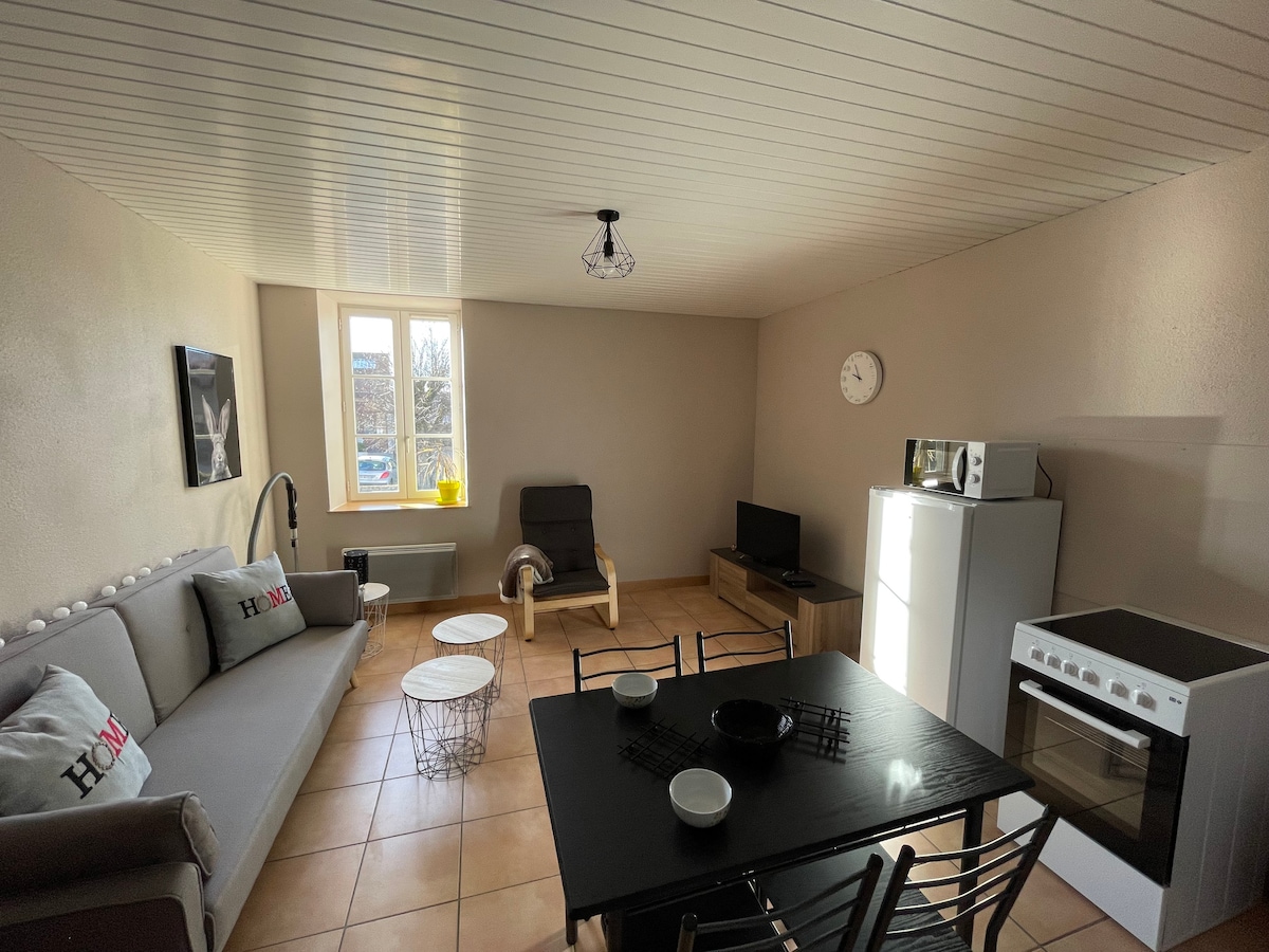 Stan površine 39m ², dobro osvijetljen na 1. spratu u malom selu sa sadržajima (pekara, supermarket, bar/duhan udaljen 100 m). 30 km od Moulins, 45 km od Montluçona i 10 km od Bourbon L 'archambault (spa grad). Uključujući: opremljena kuhinja (frižider, rerna, mikrovalna pećnica, keramičke ploče za kuhanje, aparat za kafu, kuhalo za vodu, kuhinjski pribor...), otvoren za dnevni boravak s kaučem na razvlačenje, jedna spavaća soba s krevetom 140, kupatilo s tuš kabinom i sušilom za peškire, zaseban WC.