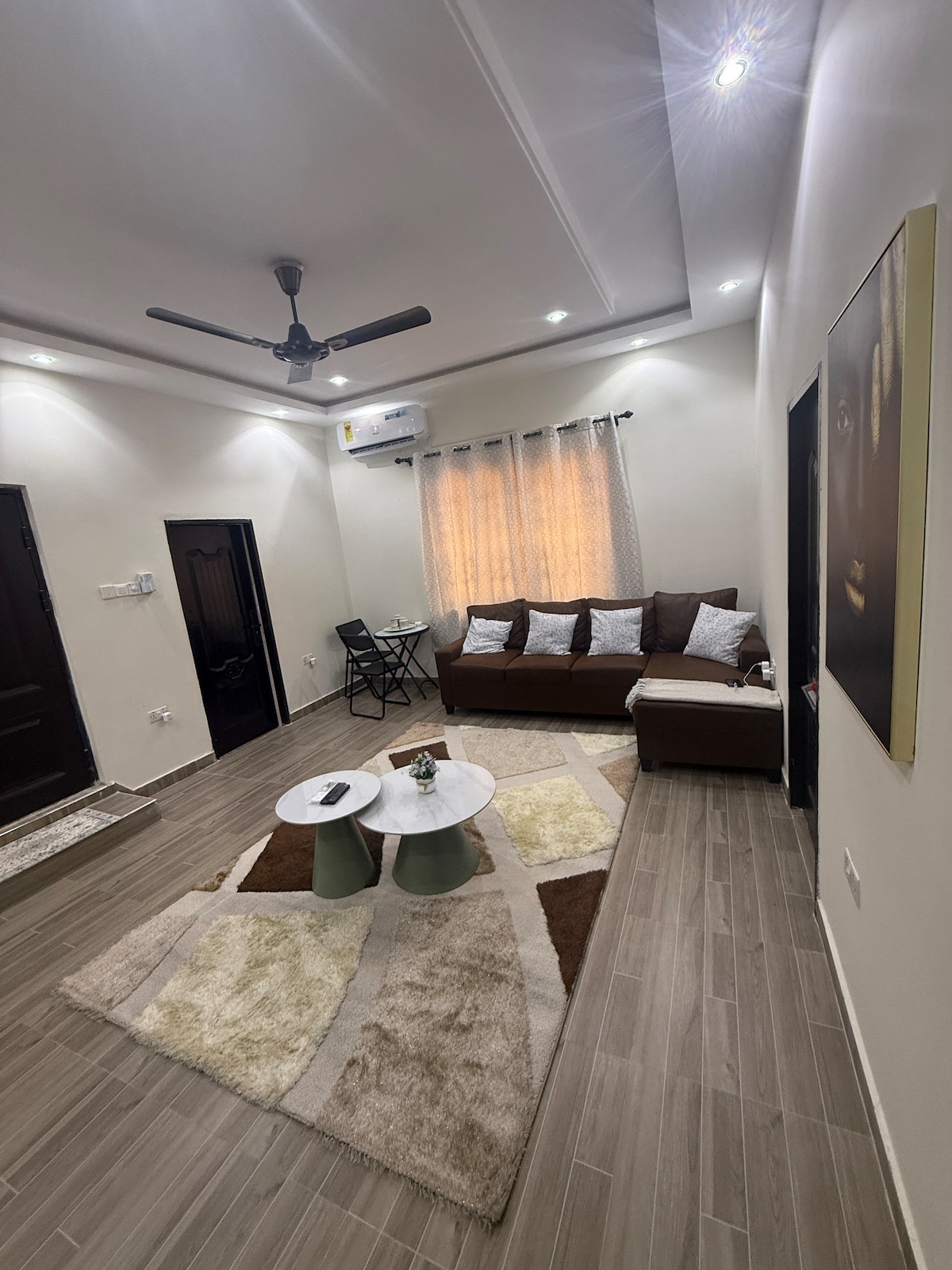 Space: A warm smoke-free studio apartment, beautifully furnished with a clean bathroom. It comes with free high-speed Wi-Fi, Air conditioning, a 55-inch Smart TV and a fully equipped kitchen with a washer. The unit has a balcony with outdoor furniture for your relaxation. The Location: Cozy studio apartment across from Accra mall. Only 10 mins drive from the Int'l airport. The property is very convenient to shops, restaurants, clubs, pub/lounges, Labadi beach and interesting places.