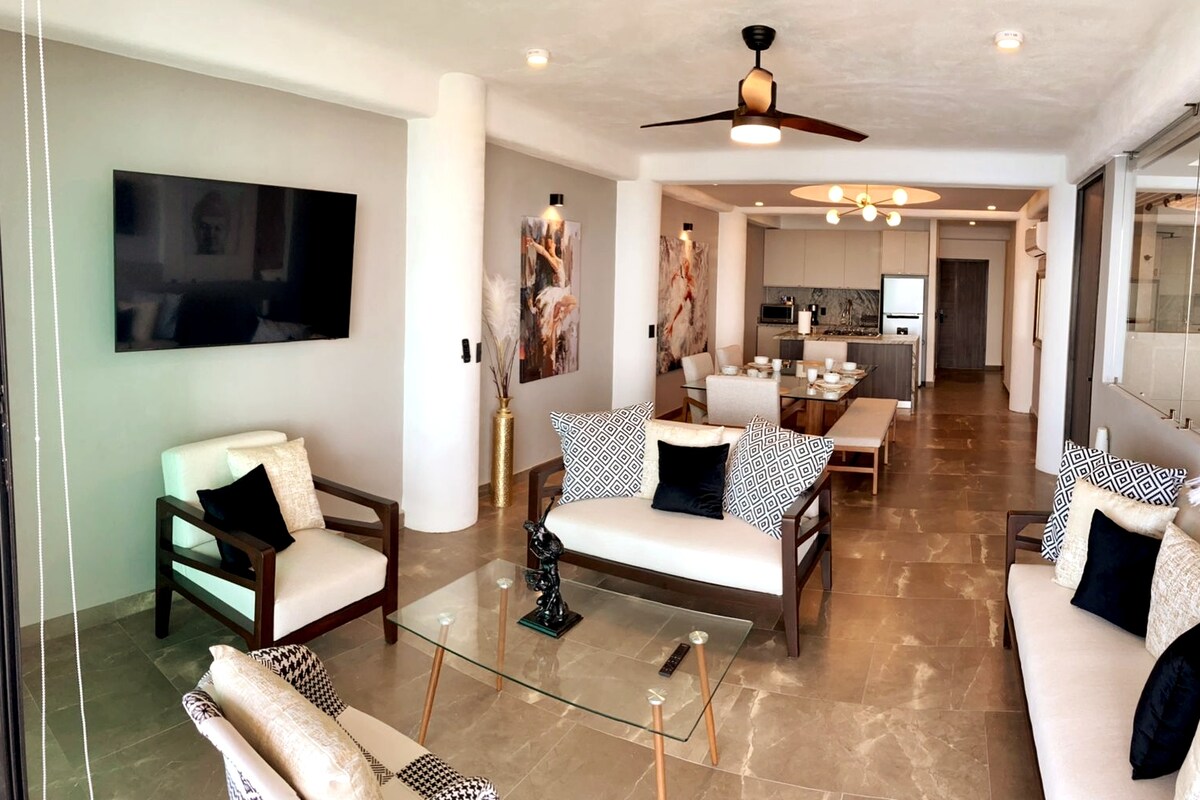 Uživajte u ovom udobnom potkrovlju na 6. spratu sa spektakularnim pogledom na okean koje se nalazi u Playa Flamingosu, Nvo. Vallarta. Uz večeru na balkonu kako biste maksimalno uživali u morskom povjetarcu. Inside private coto with 24/7 security, access to the beach, infinity pool and pool surrounded by sand. Opustite se uz uslugu bara i usmjerite hranu na sunce dok uživate u suncu. Idealno za porodice ili prijatelje koji traže more, bazen i odmor u sigurnom i ekskluzivnom okruženju. Sve je dobro za uživanje!