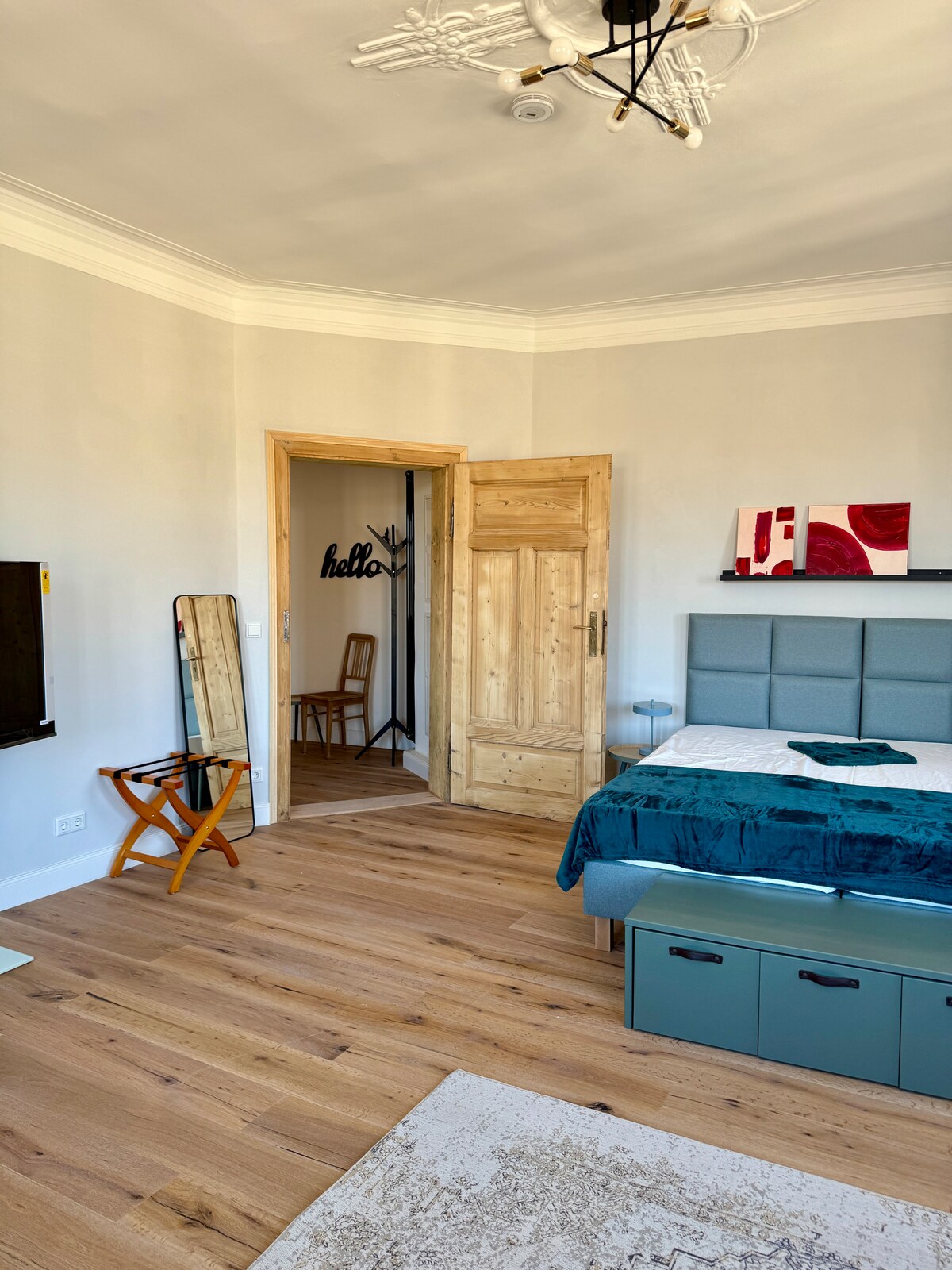 Uživajte u elegantnom doživljaju u ovom smještaju koji se nalazi u centru grada. Idealno za kolege, grupe prijatelja i porodice. Ovaj prostrani stan nudi tri prostrane spavaće sobe s bračnim krevetima, koje se također mogu postaviti kao kreveti za jednu osobu. Osim toga, tu je i potpuno opremljena kuhinja s trpezarijom, veliko kupatilo s tuš kabinom, veliki umivaonik, WC šolja, mašina za pranje veša i sušilica. Prekrasni stari građevinski prostori ispunjeni svjetlošću.