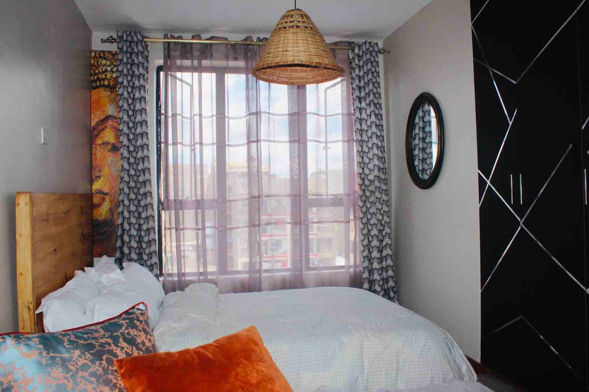 Studio Sanan u srcu Nairobija Pobjegnite u naš elegantni studio, u živopisnom Nairobiju s afričkim ukrasnim detaljima. Ovo udobno utočište nudi savršen spoj stila, udobnosti i praktičnosti. Studio se nalazi u blizini aerodroma JKIA i terminala SGR, a u blizini su supermarketi, trgovine i dostupni prevozni sredstva. Nudi siguran parking i osiguranje 0–24. Savršeno za: - Poslovni putnici - Parovi -Solo avanturisti - Putnici u tranzitu Rezervišite sada i doživite dom daleko od doma!