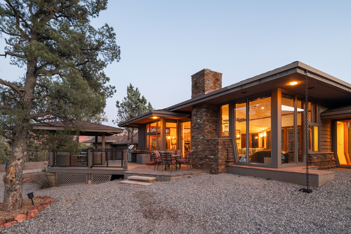 Veličanstveni pogledi na crvene stijene i slikovite panorame u kanjonu Oak Creek, samo 10 minuta od gornjeg dijela Sedone i stijene Slide Rock! Zidovi od stakla i predivno ažurirana unutrašnjost stvaraju vrlo poseban odmor s mnogo prirodnog svjetla i privatnosti. Uživajte u jogi na terasi, promatranju zvijezda, izlasku sunca dok pijuckate kafu i zalazak sunca na našim stolicama bez gravitacije. Zaspite ispod krovnog prozora planetarija glavne spavaće sobe ili se okupajte dok posmatrate zvijezde kroz krovni prozor kupatila.