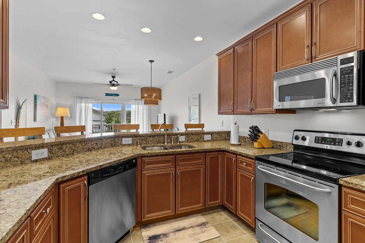 This spectacular ocean view condo with top notch renovations is just steps from the beach. Be swept away by the view of the rolling waves, whitecaps, and the OKI Pier as you relax and enjoy a beverage on the balcony. You will also be treated to a breathtaking sunset as the colors change each minute across the sky. Retire to the living room and rest your tired feet on a comfy sectional sofa as you interact with others in an aesthetically pleasing open floorplan setting.