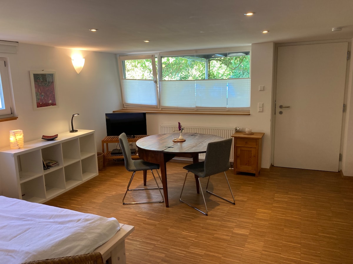 Vrtni stan u poželjnoj četvrti Herdern, vrlo lijepa četvrt sa starim zgradama , vilama i avenijama sa starim drvećem, 2 sobe, kuhinjom, kupatilom, saunom, mirnim, a ipak blizu centra Freiburga, dobra infrastruktura. Prekrasni pubovi, kafići i restorani ( Baden ,španska, italijanska i azijska kuhinja ) na pješačkoj udaljenosti. U blizini su Schloßberg, Stadtgarten,Botanički vrt i groblje Alter.