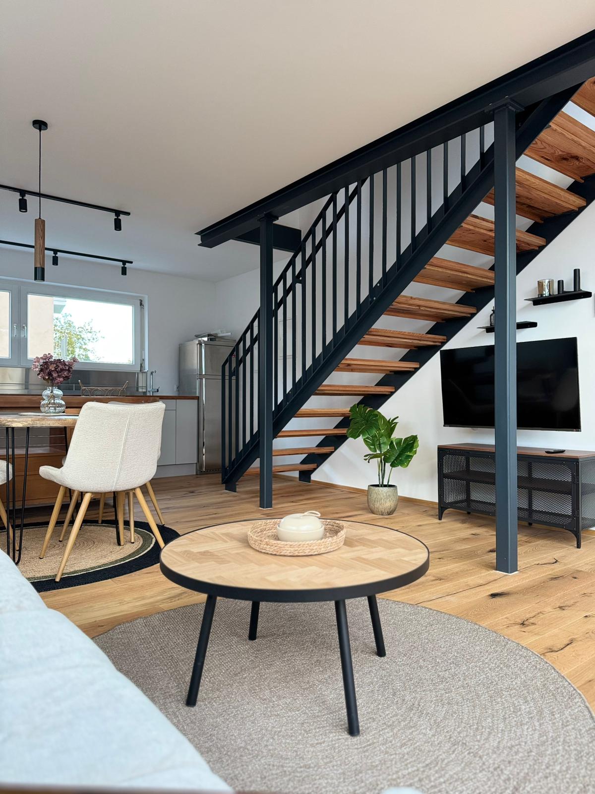 Malo potkrovlje se nalazi u prizemlju veličanstvene kuće. Moderan je i udobno namješten: elegantno kupatilo u crnoj i mesinganoj, bijeli gipsani zidovi od kreča, grijani dizajnerski betonski pod, mnogo prozora, direktan pristup vrtu. Prostor ispunjen svjetlošću, mir i vrt vas pozivaju da se opustite. Pogled na brda i Alpe čini da žudite za planinarenjem i biciklizmom. Željeznička stanica i seoski trg s restoranima i prodavnicom udaljeni su samo nekoliko koraka (4 min).
