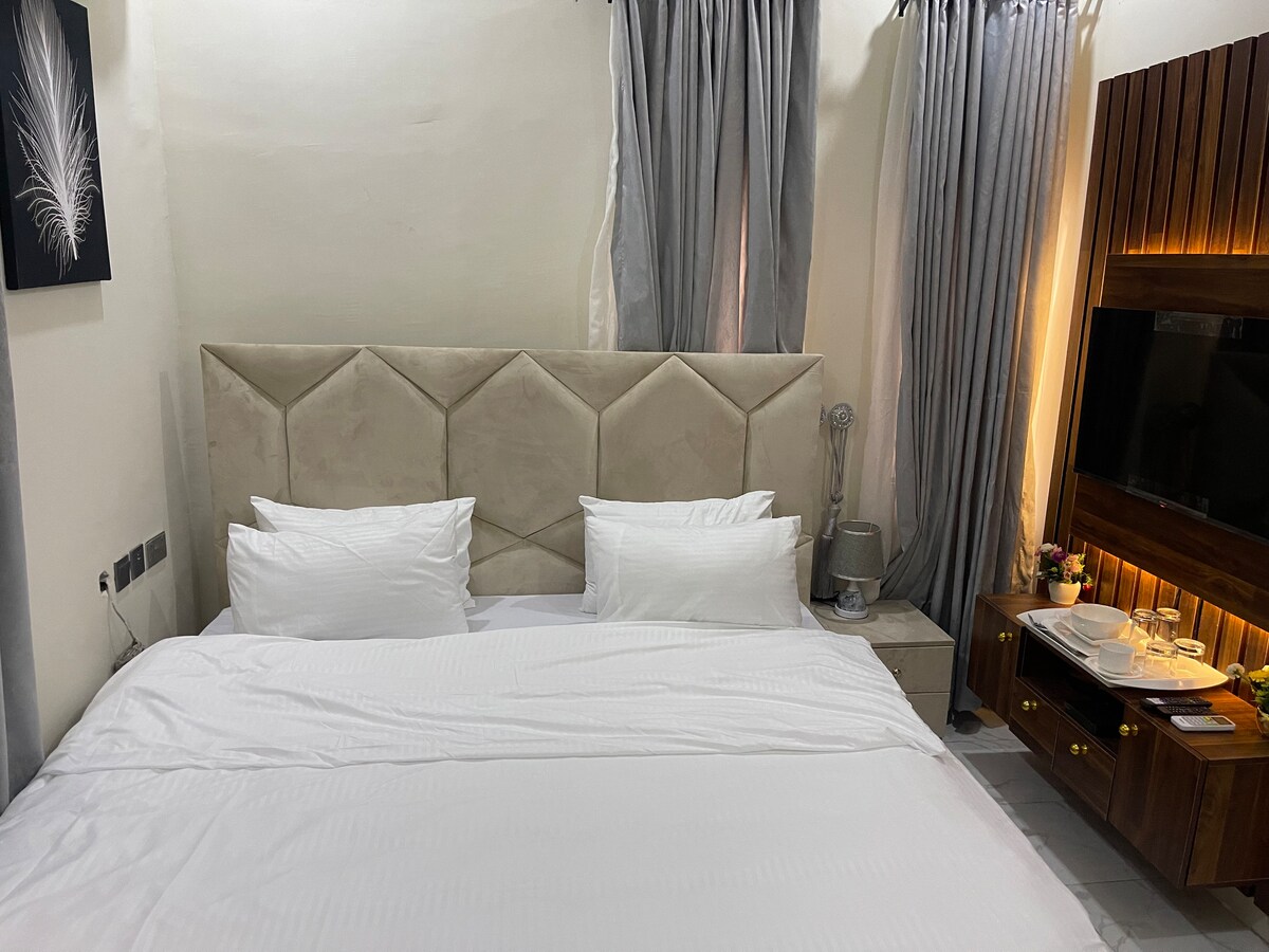sa sadržajima kao što su pametni led TV s USB priključkom, mini frižider, klima-uređaj, radni sto, pribor za pripremu čaja i kafe, kauč, Wi-Fi . Stan se nalazi u centru grada u roku od 5 do 10 minuta vožnje do međunarodnog aerodroma Murtala Mohamed, gradskog tržnog centra Ikeja i drugih mjesta za druženje. Imamo: 4 jedinice jednokrevetnih soba za rukovodioce s WI-FI MREŽOM, Netflixom i Google televizorima. Naše okruženje je osigurano, a ambijent je skoro ništa od toga. Spokoj je naša straža.