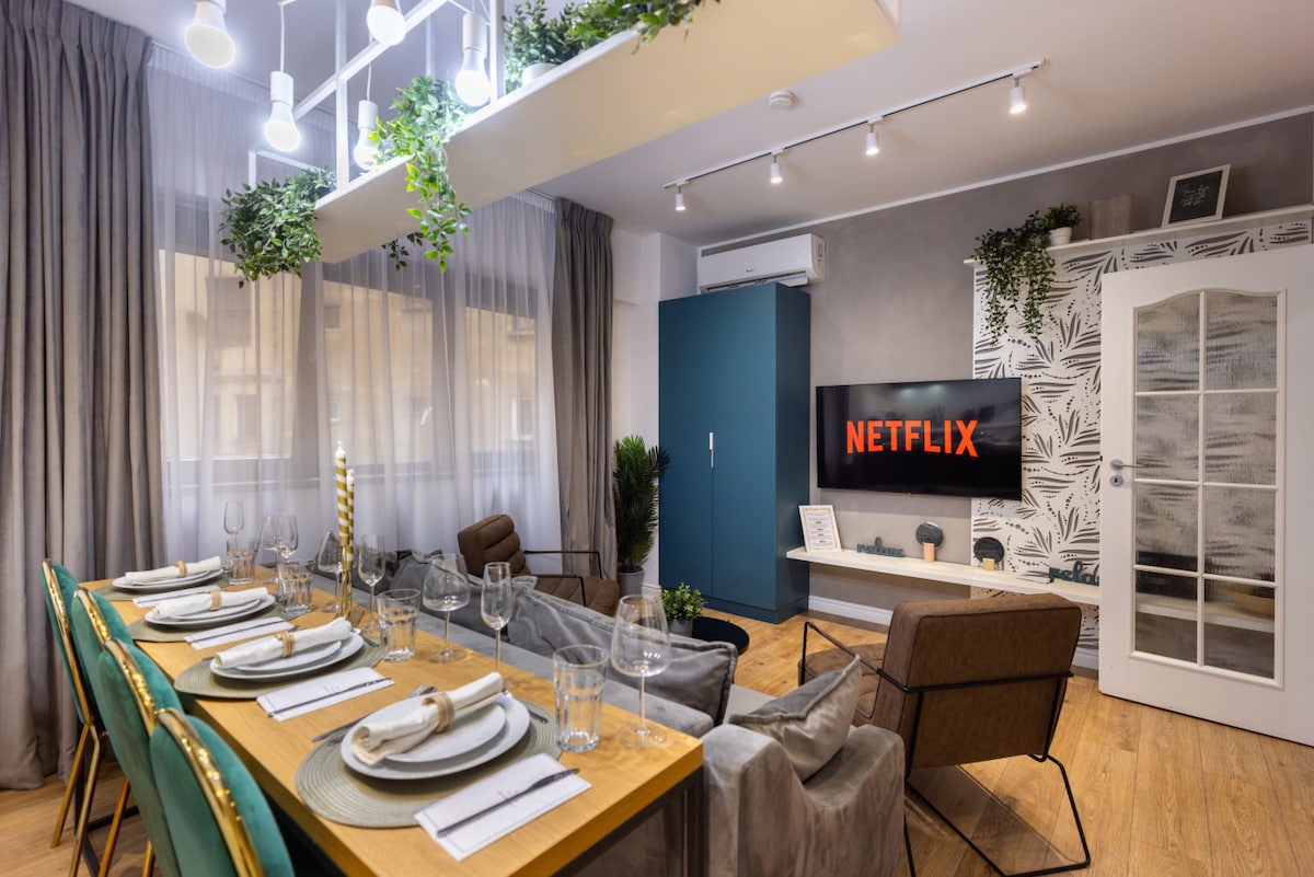 Quiet central apartment with terrace views, just a short walk from Old Town, museums, cafés and Sala Palatului. Newly renovated and designed for comfort, the flat offers high ceilings, fast Wi-Fi, self check-in, a dedicated workspace, air conditioning, a fully equipped kitchen and a queen bed. Ideal for couples, solo travellers and longer city stays who want to be close to everything without the noise. High ceilings apartments Bucharest *MAX HBO* SkyShowtime * Local TV