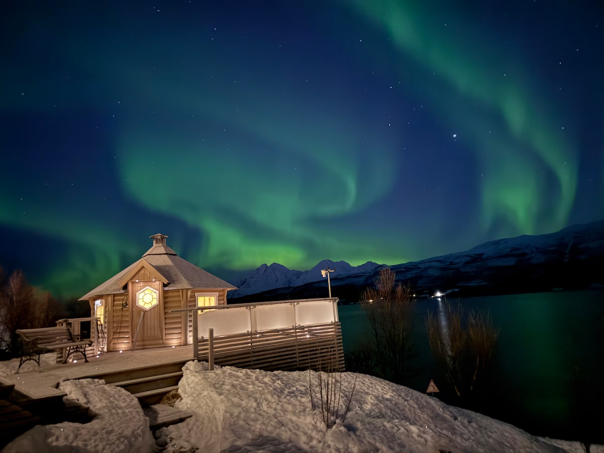 Aurora u brvnari Lyngen sa saunom i pogledom na fjord