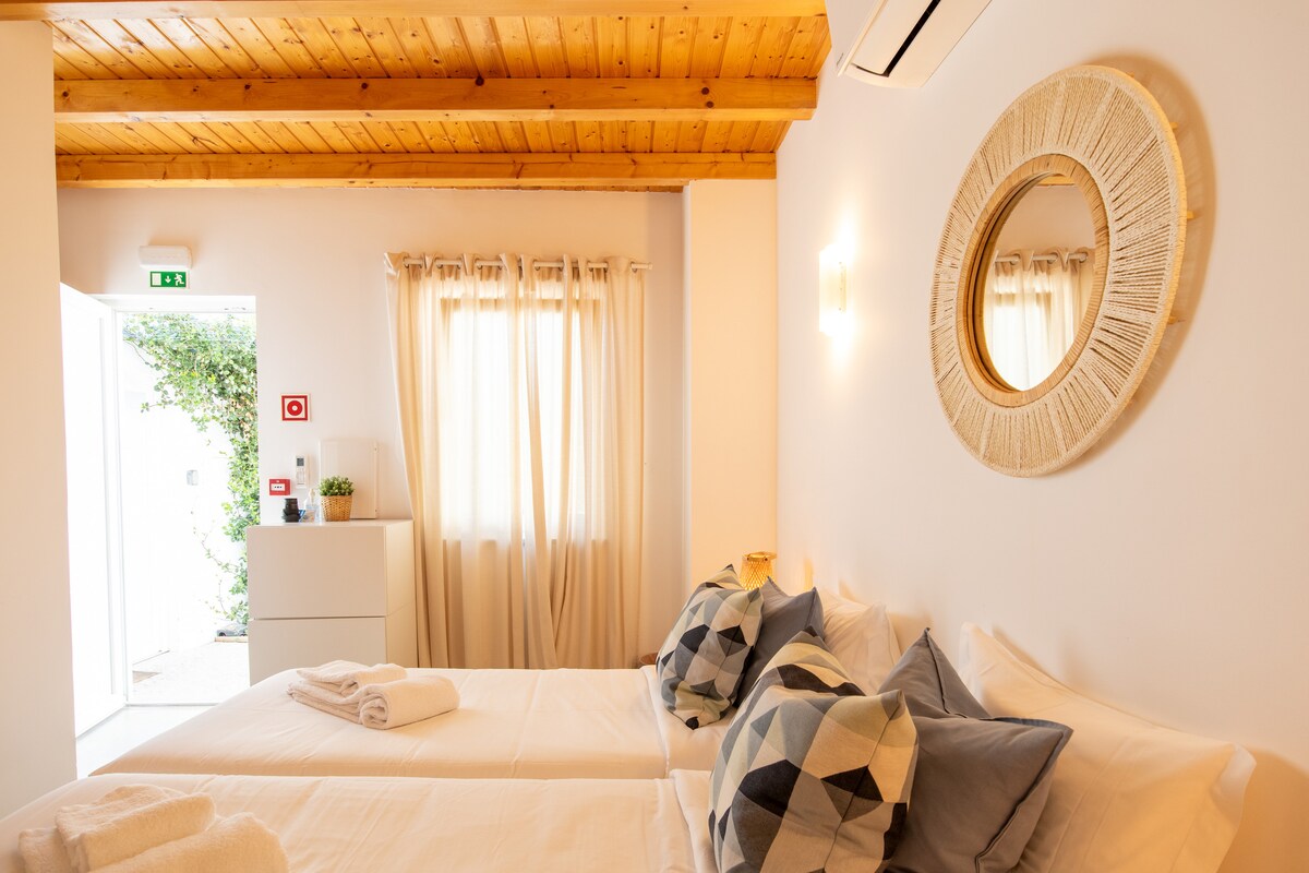 U Quinta da Capelinhi, kvalitet i udobnost su uvijek na prvom mjestu, uokvireni na mjestu gdje prevladavaju zvukovi prirode. Gostima nudimo moderne sadržaje kako bismo im pružili najbolje iskustvo u agroturizmu i održivom ruralnom turizmu. Quinta da Capelinha je odličan smještaj na granici između grada i Algarve planina, a naši smještaji su opremljeni tako da imaju sve što vam je potrebno za fokusiranje na važnu stvar - opuštanje i zabavu! Opustite se sa stilom u ovoj udobnoj sobi sa bračnim krevetom od 17 m² sa svom osnovnom opremom za ugodan boravak. Uživajte u 2 udobna kreveta za jednu osobu (zajedno ili odvojeno) u sobi s vlastitom kupaonicom s tušem i opremljenom klima-uređajem. Lagane obroke ili pića možete držati u mini-hladnjaku, pripremiti kafu ili čaj u čajniku i večerati na terasi s priborom za jelo. Ova soba se nalazi pored pristupa salonu za doručak i ima kauč vani, savršeno konfigurisan za pojedinačne putnike ili parove koji traže praktičan i udoban boravak. Naši gosti imaju pristup vanjskom bazenu s ležaljkama za sunčanje u slučaju da žele provesti dan opuštajući se u Quinta da Capelinhi, također imaju veliki vrt s različitim nijansama za najbolje ljetne piknike s fantastičnim pogledom na čarobni zalazak sunca. Nekoliko minuta odavde možete uživati i u plažama prepoznatljivim širom svijeta po kvalitetu vode i prirodnim ljepotama. Doručak je dostupan svaki dan, a uključuje različite lokalne proizvode, kao i svježi algarvijski sok od narandže, domaće kolače, kajgana jaja, suho voće i druge jutarnje specijalitete. Quinta da Capelinha se nalazi manje od 2 km od centra Tavire, a zbog odlične lokacije pronaći ćete najbolje iz oba svijeta: odmorite se, napunite baterije daleko od gužve i vreve grada i obnovljeni mir, a s druge strane, svijet otkrića, avanture i direktnog kontakta s prirodom. Bez obzira da li se radi o produženom odmoru ili samo za vikend, naš agroturizam vam omogućava da se odmorite i uživate u tišini prirode, ili da se zaputite na selo ili najljepše plaže u Algarveu.