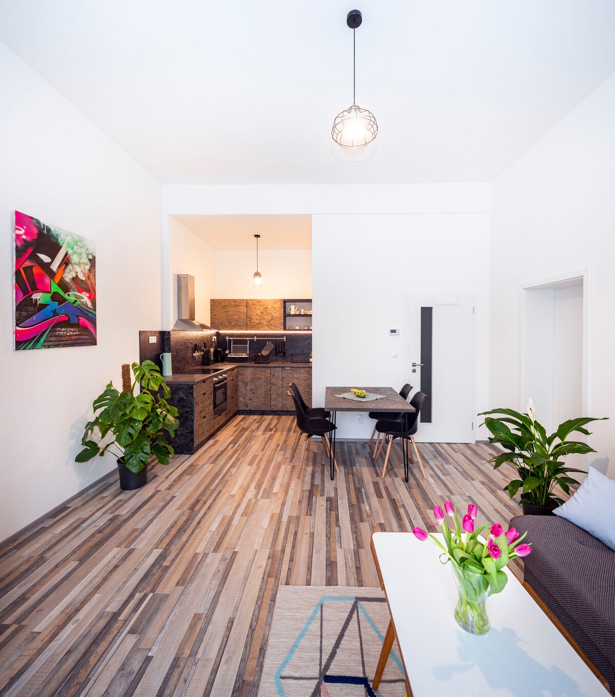 Toto jedinečné ubytování nabízí stylový design inspirovaný minimalismem a zároveň maximální pohodlí. Vysoké stropy, klimatizace a žaluzie vytvářejí příjemné a vzdušné prostředí pro odpočinek. Byt se nachází v klidné části Olomouce u řeky Moravy, přesto jen pár minut od historického centra. Soukromá zahrádka a kvalitní vybavení, místo televize projektor , podtrhují důraz na klid, soustředění a skutečný relax.