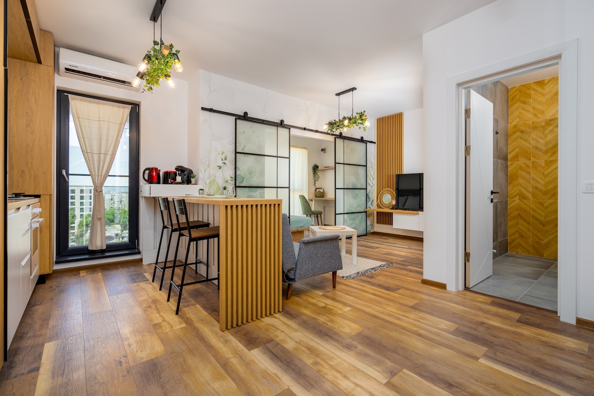 Potpuno novi studio apartman sa modernim dizajnom i nevjerovatnim pogledom na grad, koji se nalazi u novom stambenom kompleksu. Garsonjera se nalazi na samo 4 minute hoda od stanice podzemne željeznice 1 Decembrie 1918, pored zgrade imamo supermarket Lidl, Auditorium Pallady i jednostavan pristup. Besplatan parking je dostupan i tokom vašeg boravka. U udobnom studiju imamo pametni TV+Netflix, besplatan Wi-Fi i mogućnost samostalnog provjere.