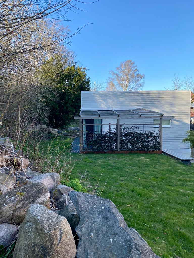 Attefallshus od 25 kvadratnih metara, visoko smješten na Näsetu s fantastičnim pogledom na južni arhipelag Göteborga. Ovdje živite s morem kao susjedom i ugodnom borovom šumom odmah ispred vrata. Kuća je privatno smještena u odnosu na kuću za stanovanje i da biste došli do nje, morate se popeti velikim brojem stepenica. S krovne terase pruža se pogled na južni arhipelag Göteborga.