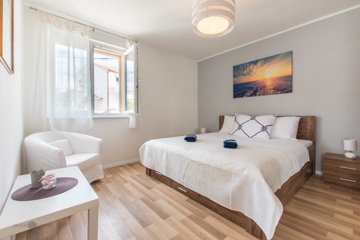 To je izuzetno svijetao i neobičan stan s 4 zvjezdice za prave hedoniste. Sve je udaljeno samo nekoliko minuta: plaže, centar, sportski centar, hitna pomoć, pošta, banka, barovi, restorani itd. Možete uživati na našoj velikoj terasi s odličnim pogledom na more i stari grad ili se samo rashladiti, u stanu, koristeći klima uređaje. Iako imamo Wi-Fi, TV i satelit, nemojte ga često koristiti, to možete raditi kod kuće, radije provodite vrijeme pekući ribu na našem, vanjskom roštilju.