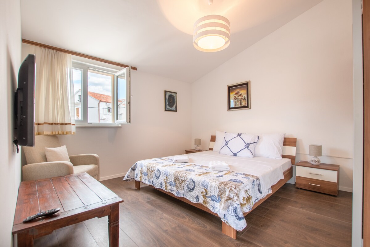 Apartman se nalazi u blizini centra i 50m od prekrasne plaže. Dvosoban stan sa kompletno opremljenom kuhinjom, kupatilom sa tuš kadom i trpezarijom. Opremljen je klima uređajem i wi-fi.