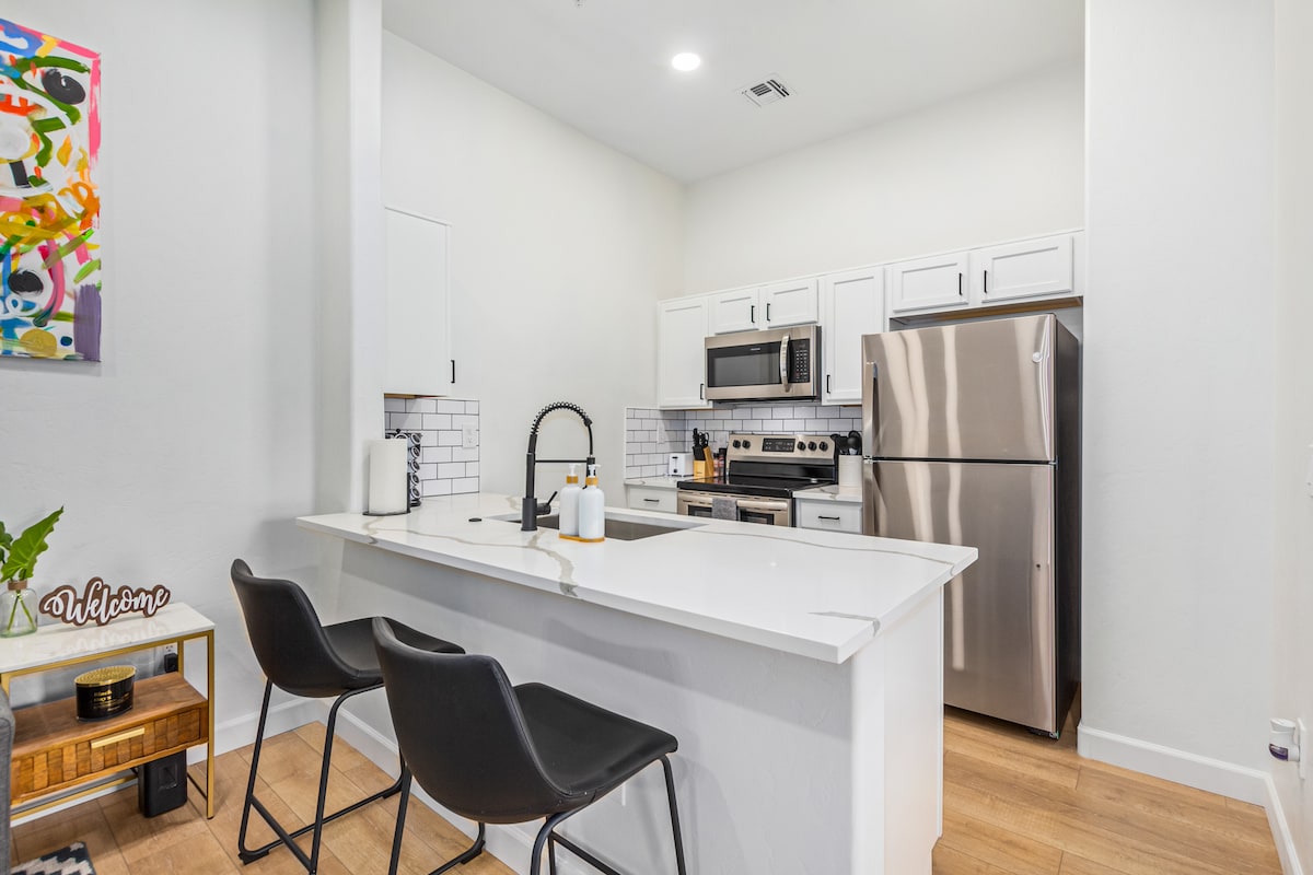 Ovaj stan na spratu nudi osjećaj osamljenosti sa fantastičnim sadržajima. Sve što vam treba je ovdje! Popnite se svojim privatnim stepenicama i uđite u ažuriranu oazu u jugozapadnom stilu, s mnoštvom prirodnog svjetla, privatnim lanaijem i pogledom na obližnje planine, pustinju i gradska svjetla. Potpuno namješten, savršen za dugoročni odmor. Kuhinja je u potpunosti opremljena svime što vam je potrebno za pripremu ukusnog obroka. Zajednica ima 2 bazena/spa centra, fitness centar i teniski teren.
