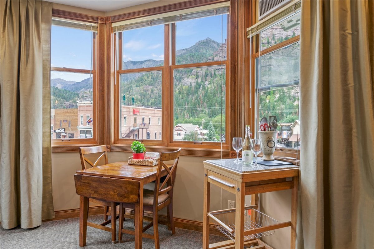 Welcome to our 1 bed | 1 bath condo in Main Street, Ouray. With its charm and capacity to comfortably sleep four guests, this is the ideal retreat for couples, friends, or small families seeking an unforgettable mountain getaway. Upon entering our condo, you'll be greeted by a warm, inviting atmosphere combining modern luxury with rustic mountain aesthetics. The open-concept living/ dining/kitchenette area has breathtaking town views and mountains.