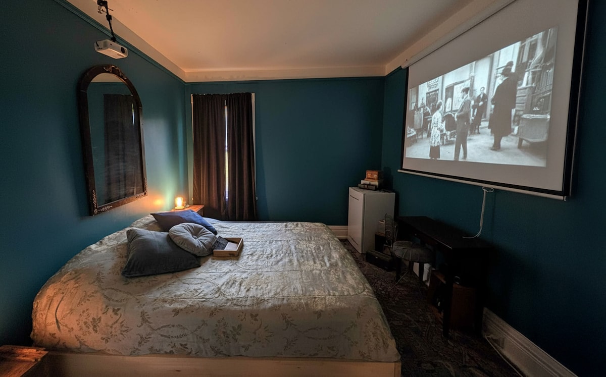 Doživite Cineast Blue Room at Le Salon des Inconnus - udoban, filmski smještaj na lijepo očuvanom viktorijanskom imanju iz 1898. godine. Okruženi starinskim filmskim dekorom i umirujućim plavim tonovima, uživajte u privatnim filmskim večerima s vlastitim projektorom i srebrnim ekranom. Savršeno za ljubitelje filma, umjetnike i porodice koje traže inspiraciju i dašak historije.