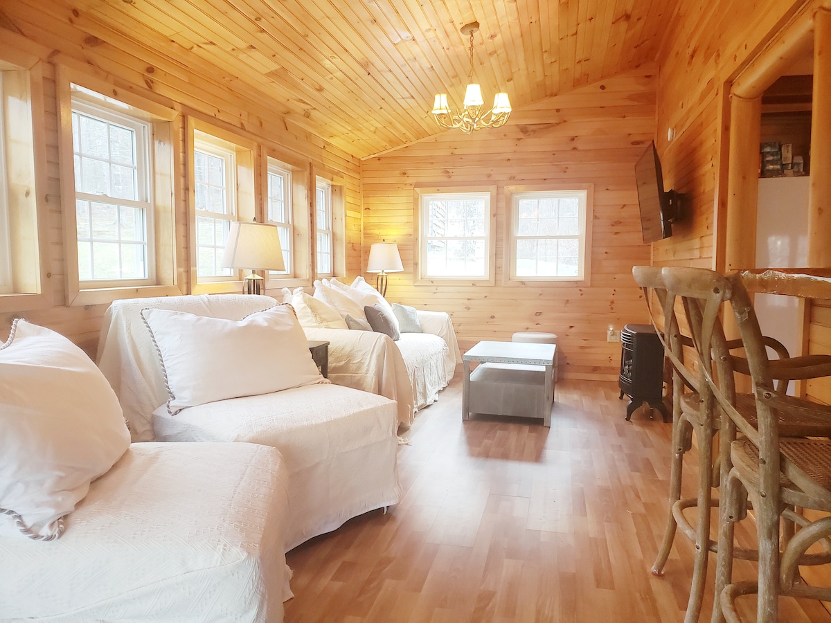 Izgradili smo brvnaru Wren kako bi bila spokojan prostor ispunjen svjetlom i umjetnošću i s mnogo udobnih detalja. Podignuti plafoni, spiralne stepenice i veliki otvoreni koncept s spavaćom sobom u potkrovlju. Brvnara također ima prekrasnu saunu na drva za one hladnije dane. Wren cabin has a large wraparound deck for relaxing and a outdoor fire pit, as well as shared access to Adams Pond. Prostor je moderan skandinavski, lagan i prozračan i ispunjen pažljivo osmišljenim detaljima.