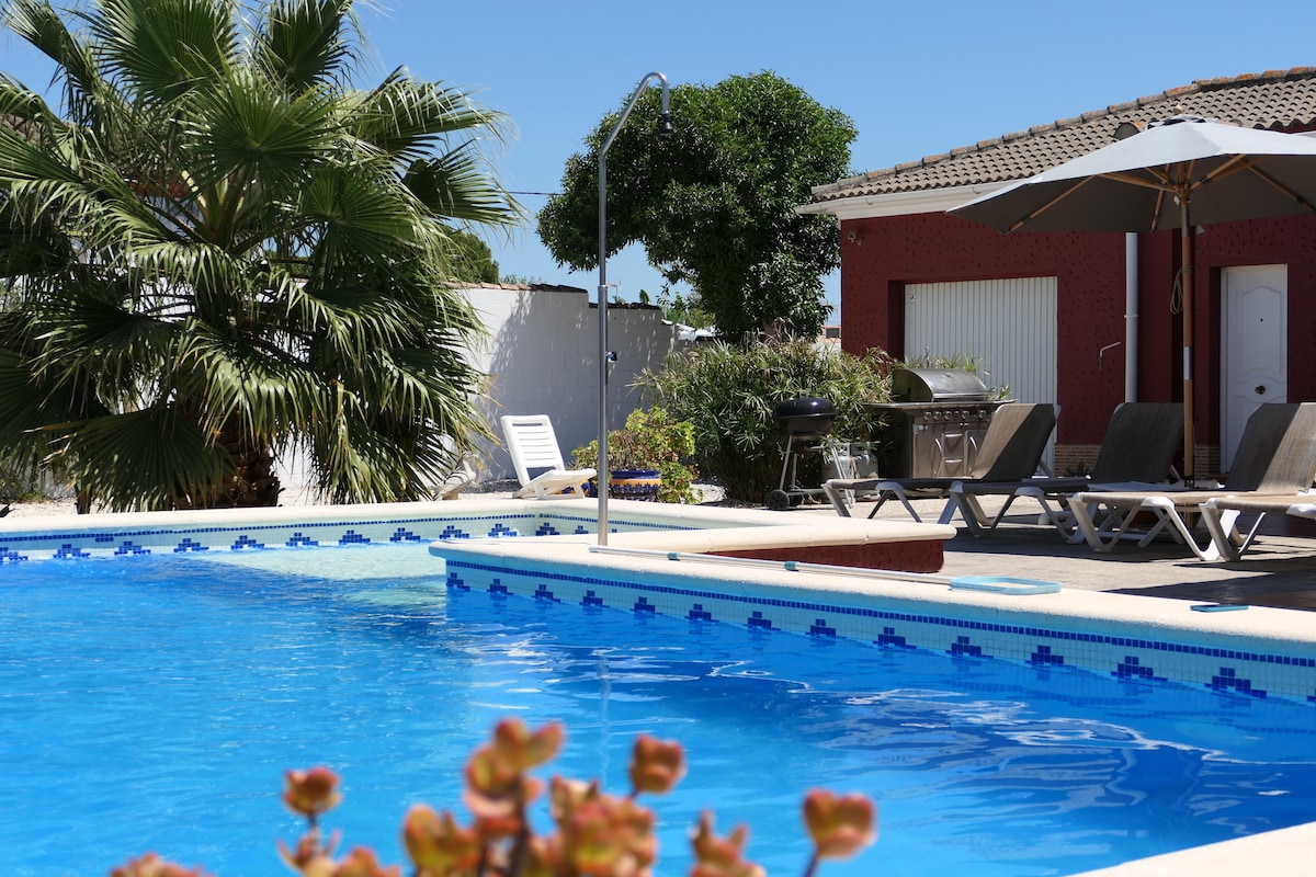 Prekrasna vila s velikim vrtom. Kuća se sastoji od tri dvokrevetne spavaće sobe, opremljene kuhinje, kupatila i dnevnog boravka. Svaka spavaća soba ima stropni ventilator. Vrt ima veliku terasu i parking. Ima i privatni bazen sa slanom vodom sa solarijumom i mjehurićima, vanjski tuš i toalet. Dostupni su plinski roštilj, roštilj na ugalj i paella. Samo 12 minuta vožnje do plaže.