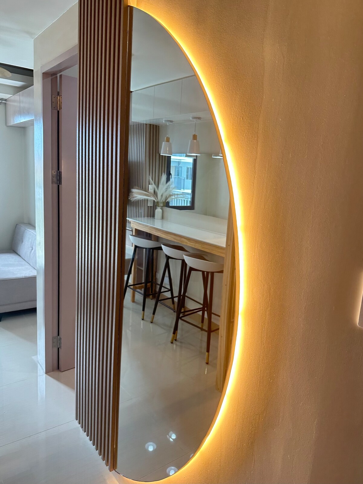 This stylish place to stay is perfect for couple trips. A beautifully designed studio with a relaxing modern zen vibe. The space features soft lighting, artistic wall panels, a cozy bed, and a comfortable seating area perfect for unwinding. Enjoy a thoughtfully arranged dining spot and a welcoming ambiance that feels calm and serene. Ideal for couples, solo travelers, or those looking for a stylish and peaceful stay.