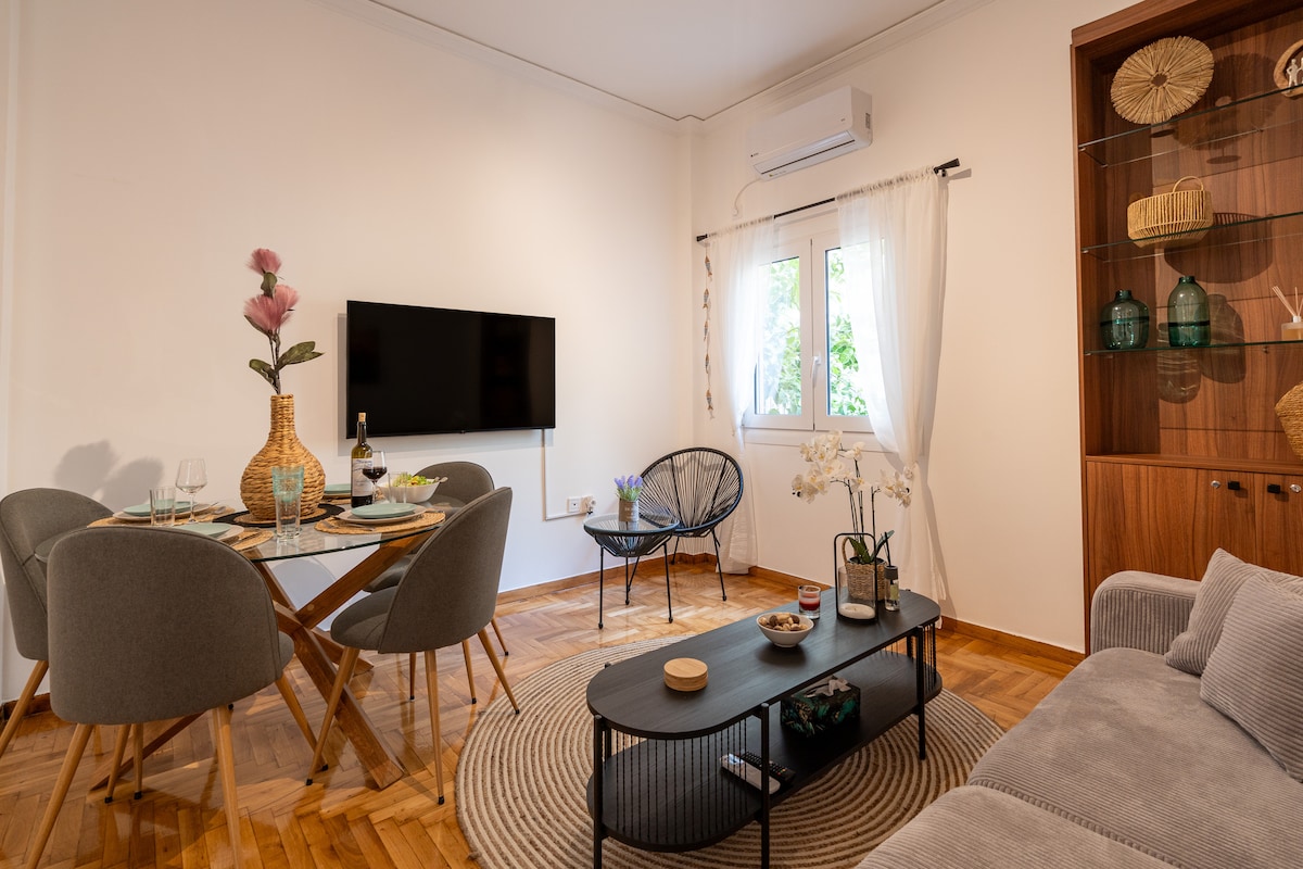 Prekrasan stan s dvije spavaće sobe u vintidž stilu u srcu Atine. 3 minute od metro stanice Evagelismos, manje od 2 km od Akropolja i nekoliko minuta od glavnih muzeja i atrakcija. Karakteristike uključuju: - Klima uređaj u svim sobama - Dizajnerski vintage namještaj - Brzi Wi-Fi - Tihi balkon s biljkama - Velika tuš kabina u ravnini poda - Novi uređaji - Otvoreni kuhinjski/dnevni prostor - Kuhinjske površine od hrastovine - Video ulazna vrata – Grijanje u svakoj sobi