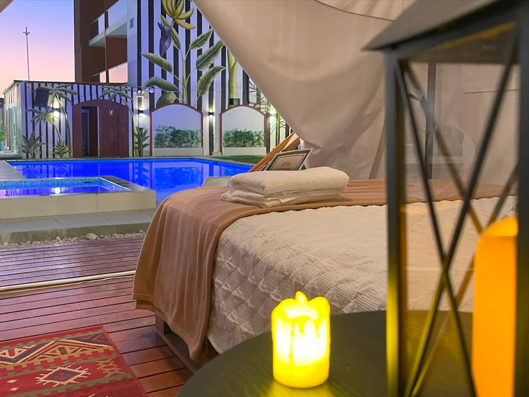 Vive una experiencia diferente y romántica en Paracas, combinando la aventura del glamping con la comodidad de un hotel. A 5 minutos de la playa El Chaco y a 10 minutos del boulevard y tours a Islas Ballestas. El precio incluye desayuno americano, acceso a piscina y estacionamiento. Ideal para parejas que buscan comodidad, privacidad y excelente ubicación.