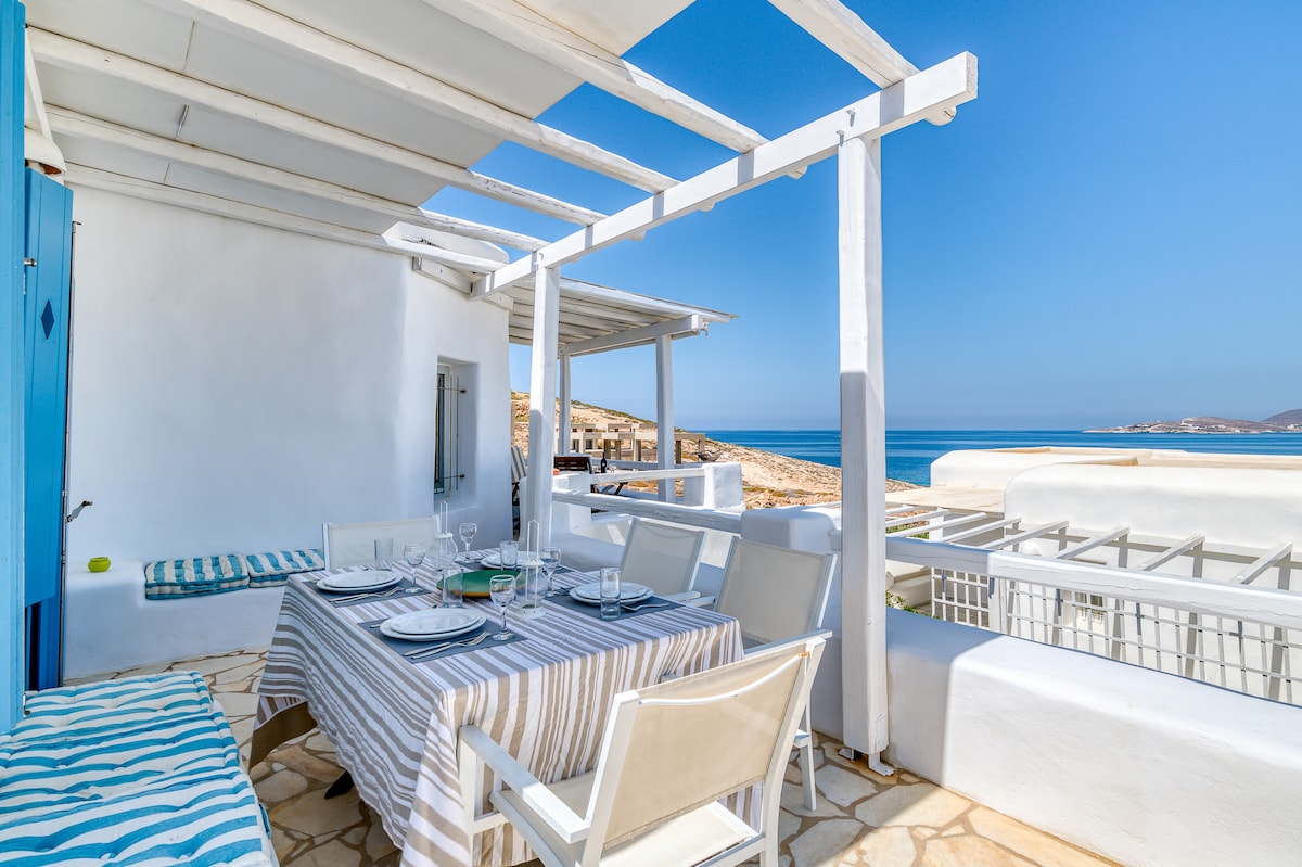 Prostrani stan napravljen od debelih kamenih zidova koji sadrži tradicionalnu rernu na drva i kamin ( koje naši gosti ne smiju koristiti). Nalazi se na vrhu malog brda pored Paroikije, tako da ćete imati priliku da se divite jedinstvenom pogledu na zaljev Paroikia i zalazak sunca.