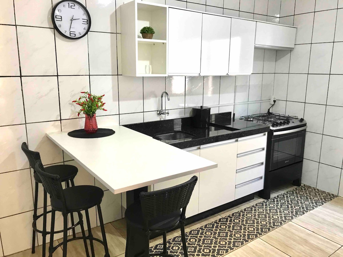 Odličan stan u stambenoj sobi za najviše tri osobe s udobnim krevetom, toplim tušem, opremljenom kuhinjom i prostorom za odmor s bazenom. Smješten u privilegovanom kvartu, siguran, u blizini pekara, supermarketa, benzinskih stanica, apoteka, barova i restorana. 300m od Av. das Cataratas, glavnog turističkog koridora grada, 9 minuta hoda od centra, 15 minuta vožnje do aerodroma i 17 minuta do prekrasnih vodopada Iguaçu.