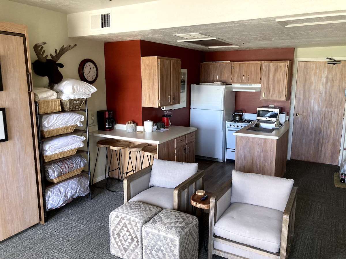 Svodni, miran studio na gornjem spratu od 360 sf. Skijališta i glavna ulica udaljena 5 minuta (oko 1,5 milje). BESPLATAN autobus vas vodi do odmarališta/shoppinga. Pogled na željezničku stazu i potok. Renovirana i lijepa! 50" HDTV, drveni podovi, plinski kamin, kuhinja, bračni krevet (za 2 osobe) i ljubavni stolica za spavanje (za 1 osobu). Masažna kada je otvorena tokom cijele godine. Bazen je otvoren tokom ljetnih mjeseci. Restorani na pješačkoj udaljenosti. Morate se popeti stepenicama. Želim da se moj studio osjeća kao kod kuće daleko od doma!