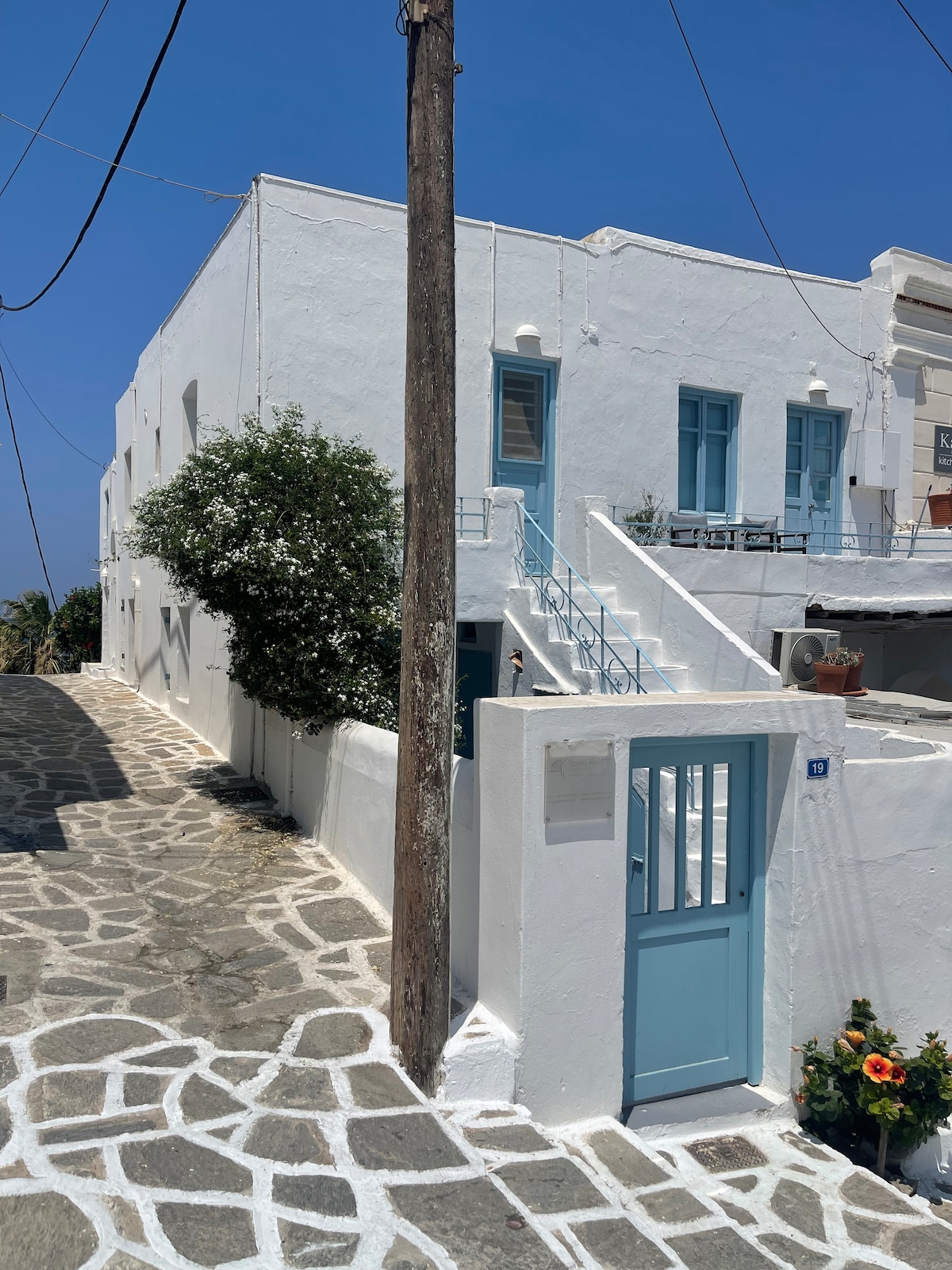Stan na prvom spratu tradicionalnog kikladskog stila s krovnim vrtom, u srcu naselja Parikia, za 4-7 gostiju. Idealno smješten, nudi mir i opuštanje te praktičnu centralnu lokaciju. Na pješačkoj udaljenosti: sve zanimljive znamenitosti (stara pijaca, frankski dvorac), pekara, prodavnice, luka, autobuska stanica i taksi stajalište. More je udaljeno nekoliko metara od kuće, a za 2 minute možete doći do ulice uz more, gdje možete uživati u pogledu na zalazak sunca.