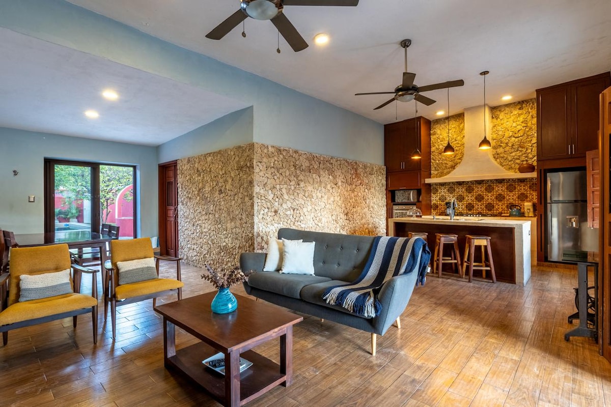 Pobjegnite u mirnu oazu s 3 spavaće sobe i 3 kupatila u historijskoj četvrti Santa Ana u Méridi. Opustite se u svom privatnom bazenu i bujnom vrtu, savršenom za porodice ili parove. Uronite u kolonijalni šarm Meride: prošetajte do Muzeja antropologije (4,5 bloka) , tržnice Santa Ana, Paseo Montejo i gastronomskog koridora, a sve to u krugu od samo nekoliko blokova. Uz prostrane dnevne prostore, klima-uređaj, brz Wi-Fi i pažljivo osmišljen dizajn, ovaj smještaj spaja udobnost i praktičnost u živopisnom lokalnom okruženju.