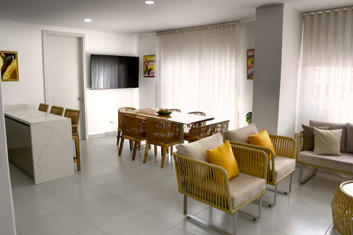 Estudio amplio y moderno, ideal para parejas, familias o grupos de hasta 4 personas. Cuenta con 2 camas dobles, aire acondicionado, cocina completamente equipada, wifi rápido, Smart TV con Netflix y baño privado con agua caliente. Ubicado en una zona tranquila y cerca del Centro Histórico, perfecto para descansar y disfrutar Santa Marta. 🔐 Acceso inteligente con tarjeta.