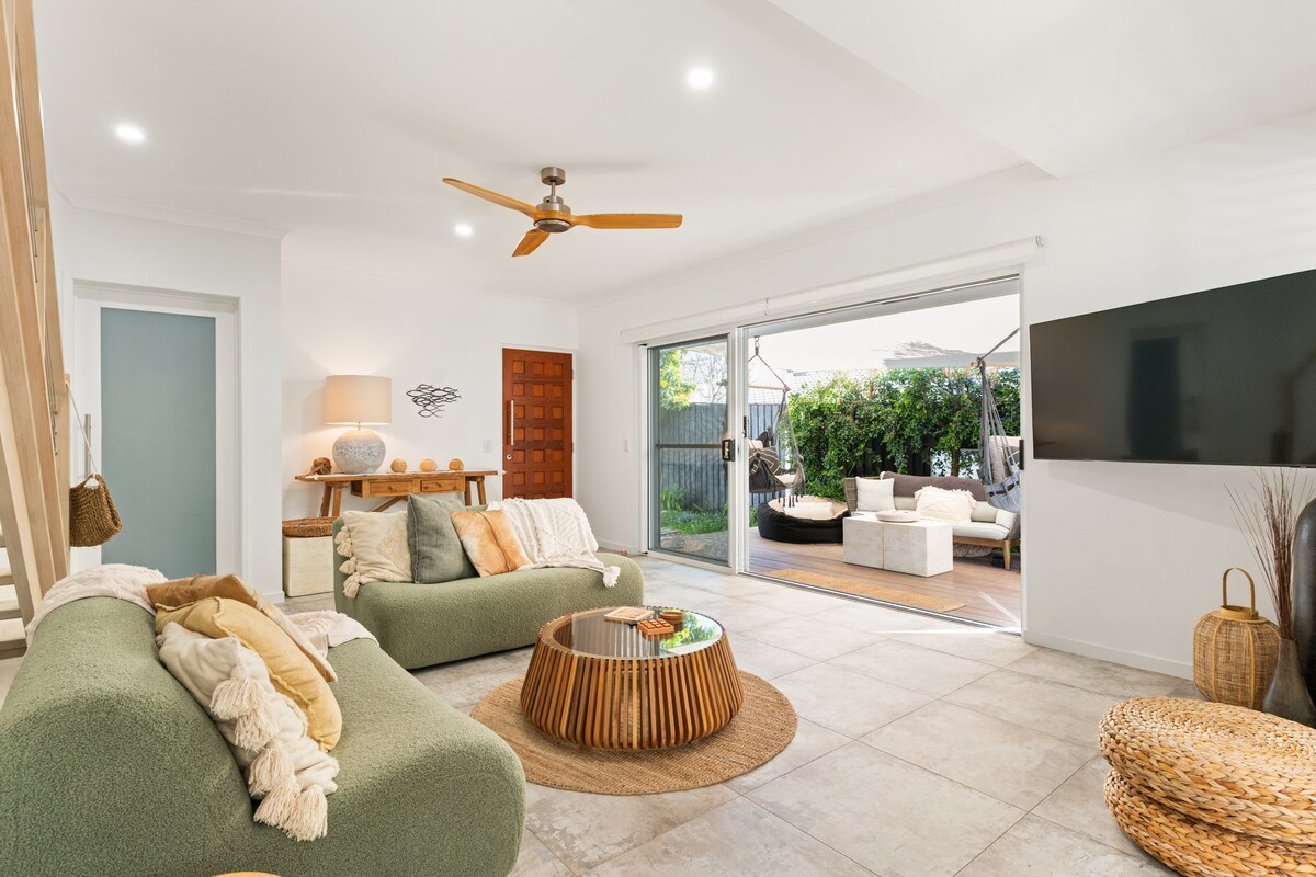 Smješten na Peregian Beachu, samo jednu ulicu od netaknute surferske plaže, kratkom šetnjom do trga Peregian Village. Pristup kroz elegantan bočni ulaz ili kroz dvostruku garažu uz ekskluzivnu upotrebu gostiju. Na gornjem spratu moderna prostrana kuhinja, klimatizovani dnevni boravak, balkon, djelimičan pogled na okean. Na donjem spratu su dvije klimatizovane spavaće sobe, privatna kupaonica sa spa kadom, vešeraj, terasa, drvena terasa. Prošećite do trgovina i restorana ili se samo opustite u objektu, uživajte u miru i surfanju u blizini.