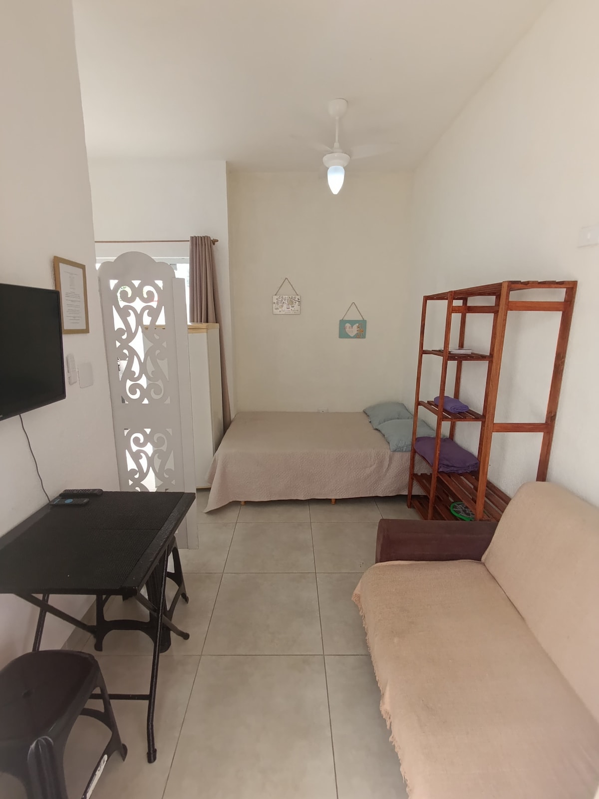 EXCEPCIONALMENTE NO DIA 27/FEV/26 checkin somente após as 17hs - Edícula independente e confortável. Ideal para no máximo 3 pessoas. Quarto com uma cama de casal e colchão de solteiro (em cima de tapete felpudo), internet, ventilador de teto, ar-condicionado e Smart TV. Banheiro (toalhas e roupas de cama). Cozinha com balcão ao ar livre, ótima para Churrasco, temos geladeira, fogão, microondas e demais utensílios. Moramos na casa da frente, eu e minha mãe.